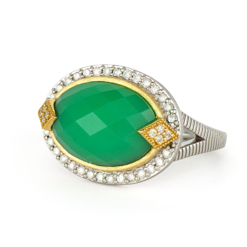 From the Mixed Metal Collection, the chrysoprase statement ring features a bold center green stone surrounded with pavé white diamonds trimmed with a gold rim. The center stone has two white diamonds set on each side of the face and features the lined milgrain shank.