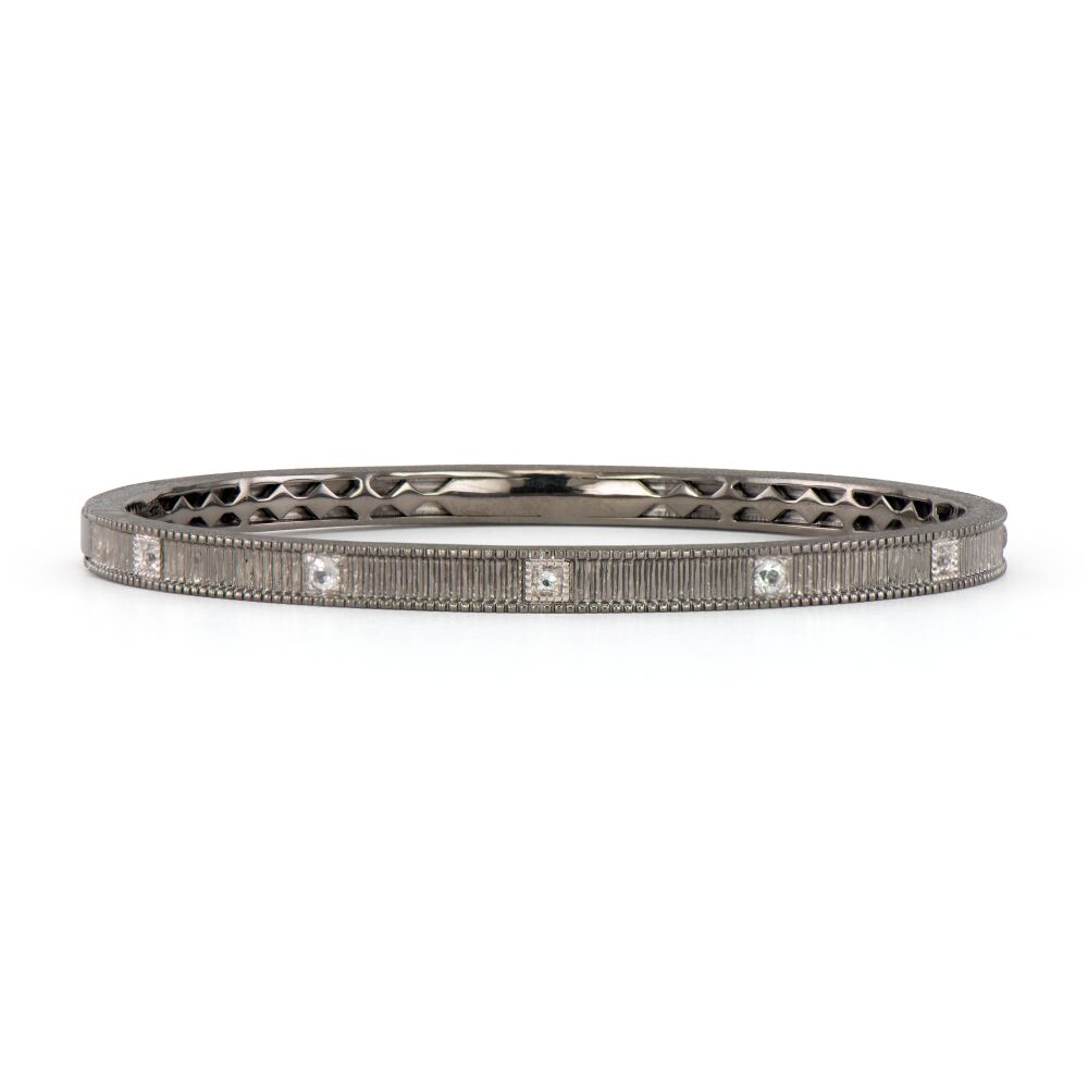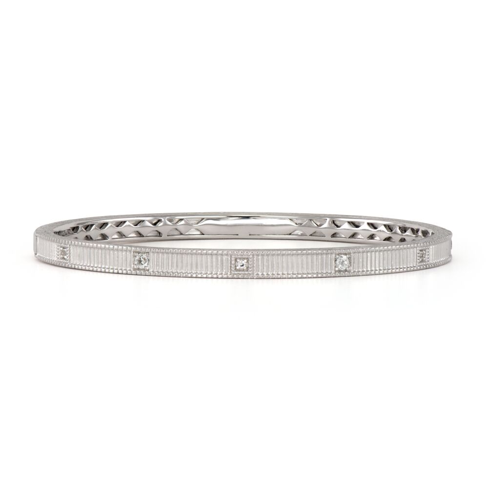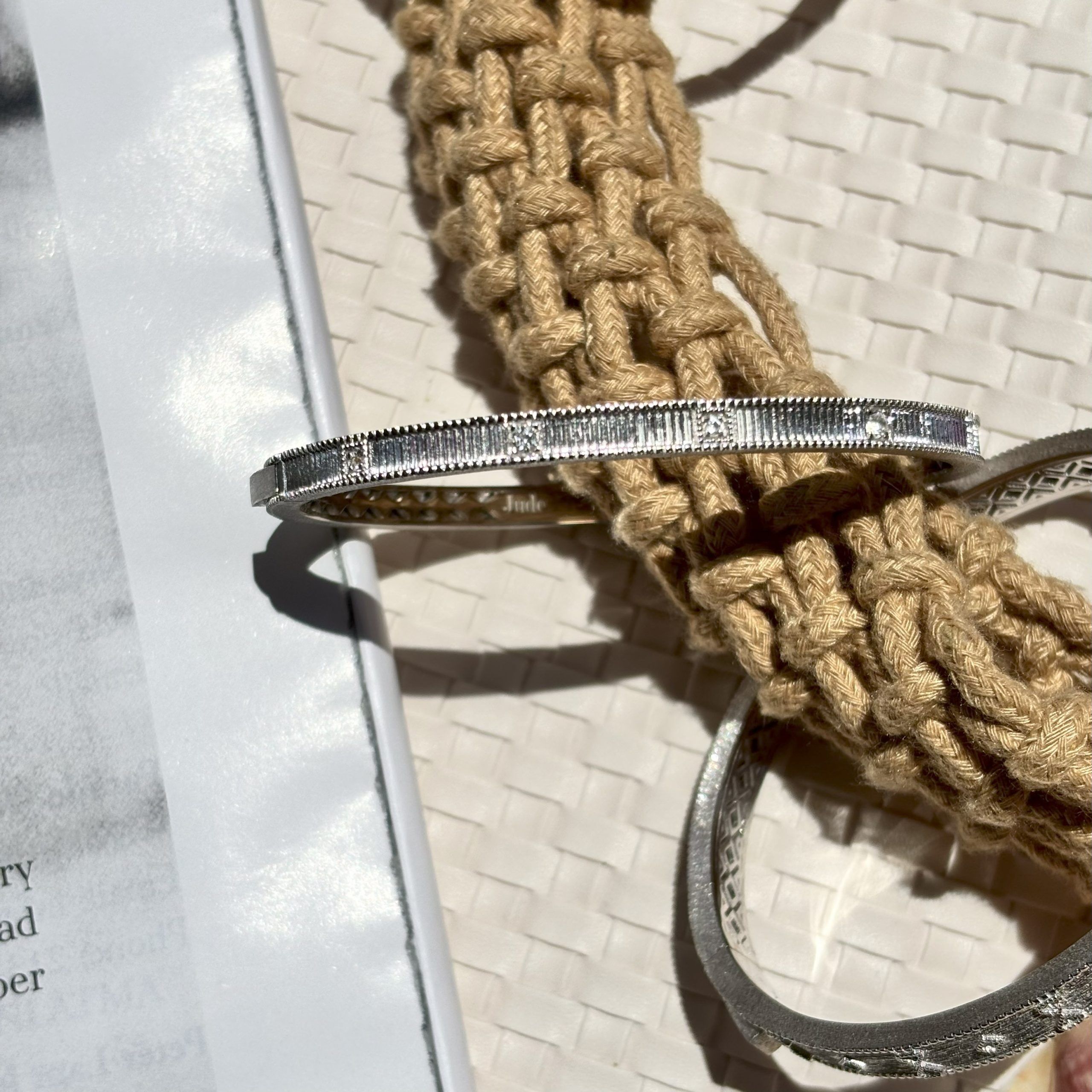 From the Lisse Collection, the Sterling Silver bangle features a thinner frame set with square white topaz stones featuring a lined and fluted metal texture. This bangle is perfect to stack and has a push-button closure.