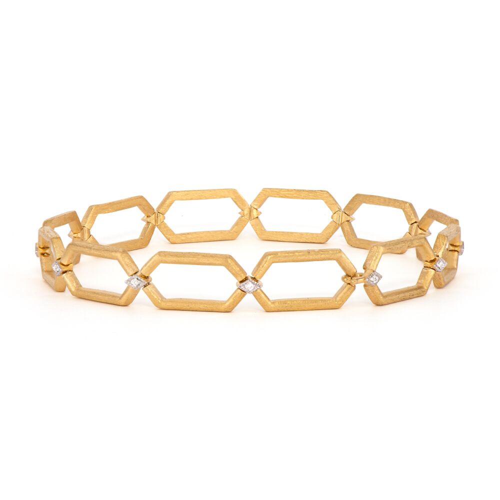 From the Lisse Collection, the open linked elongated hexagon bracelet, features eleven open links set with white diamond milgrain beads between the links. Bracelet length is 7 inches and the design features the brushed JFJ finish.