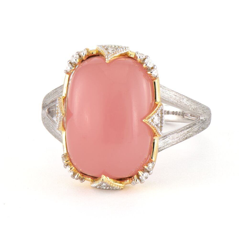 From the Lisse Collection, the cushion ring features a colorful center stone flanked by three prong set white diamonds with four triangle shapes on the face of the cushion cabochon with the JFJ signature brushed finish.