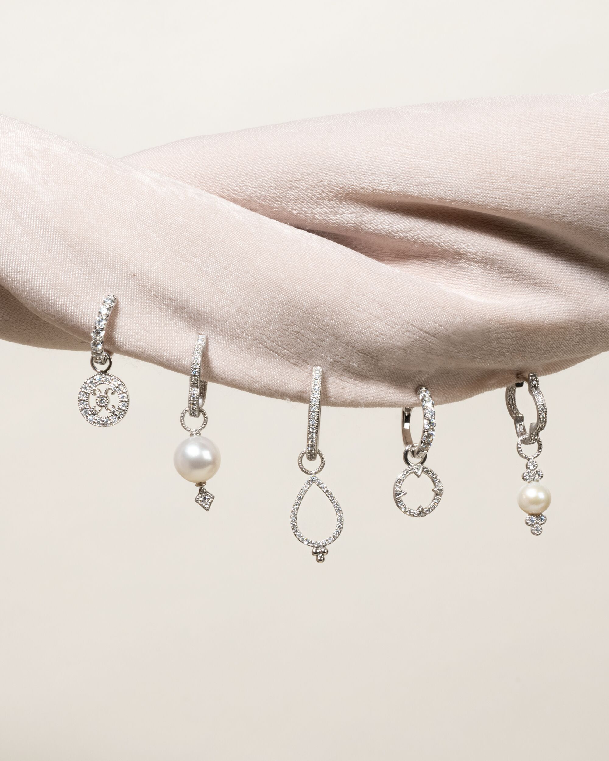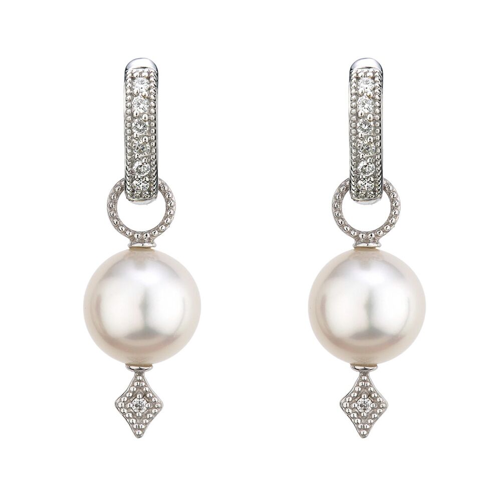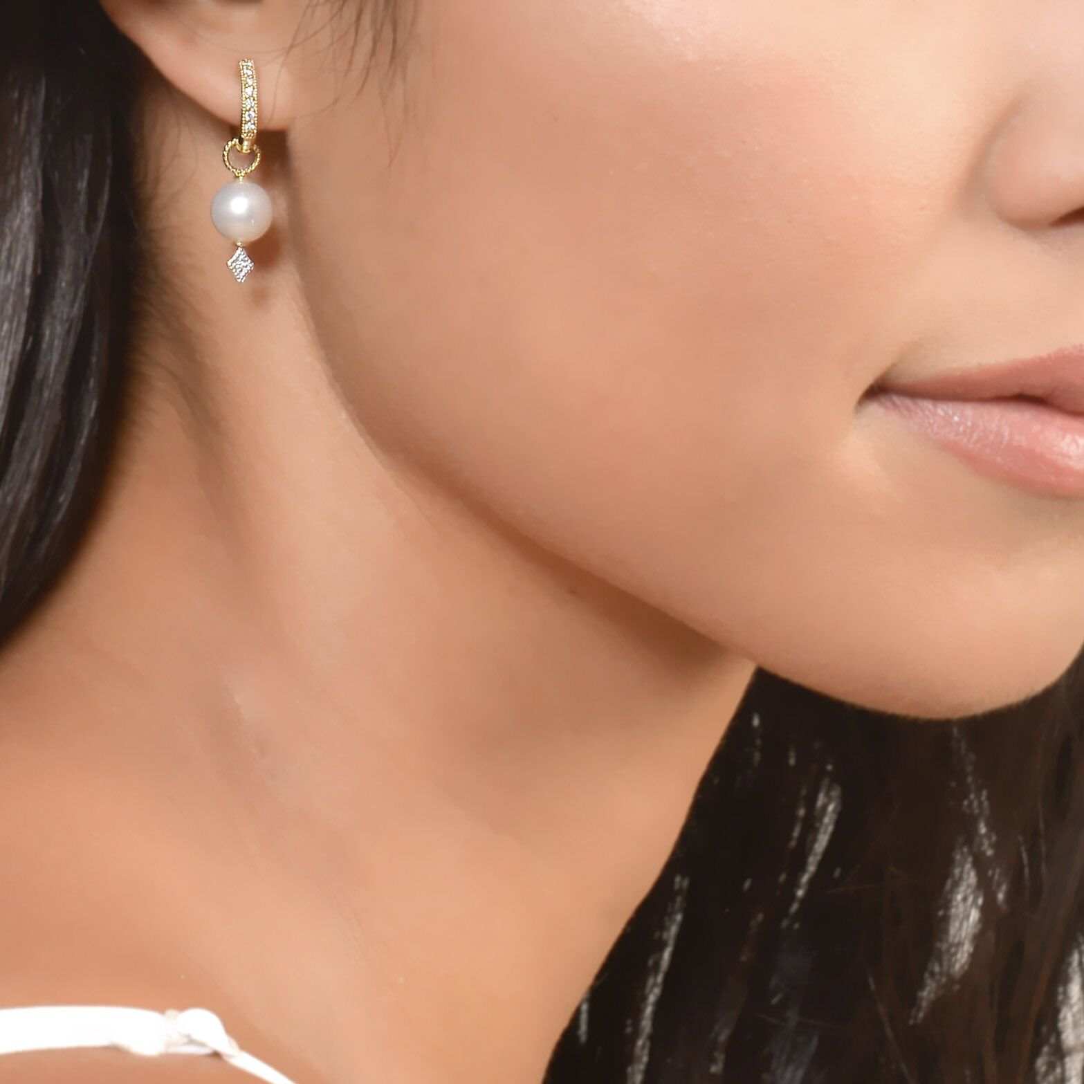 From the Lisse Collection, the Large Lisse Pearl Earring Charms feature round white pearls set in 18K gold with a pave round diamond kite accent. Hoops and earring charms sold separately.