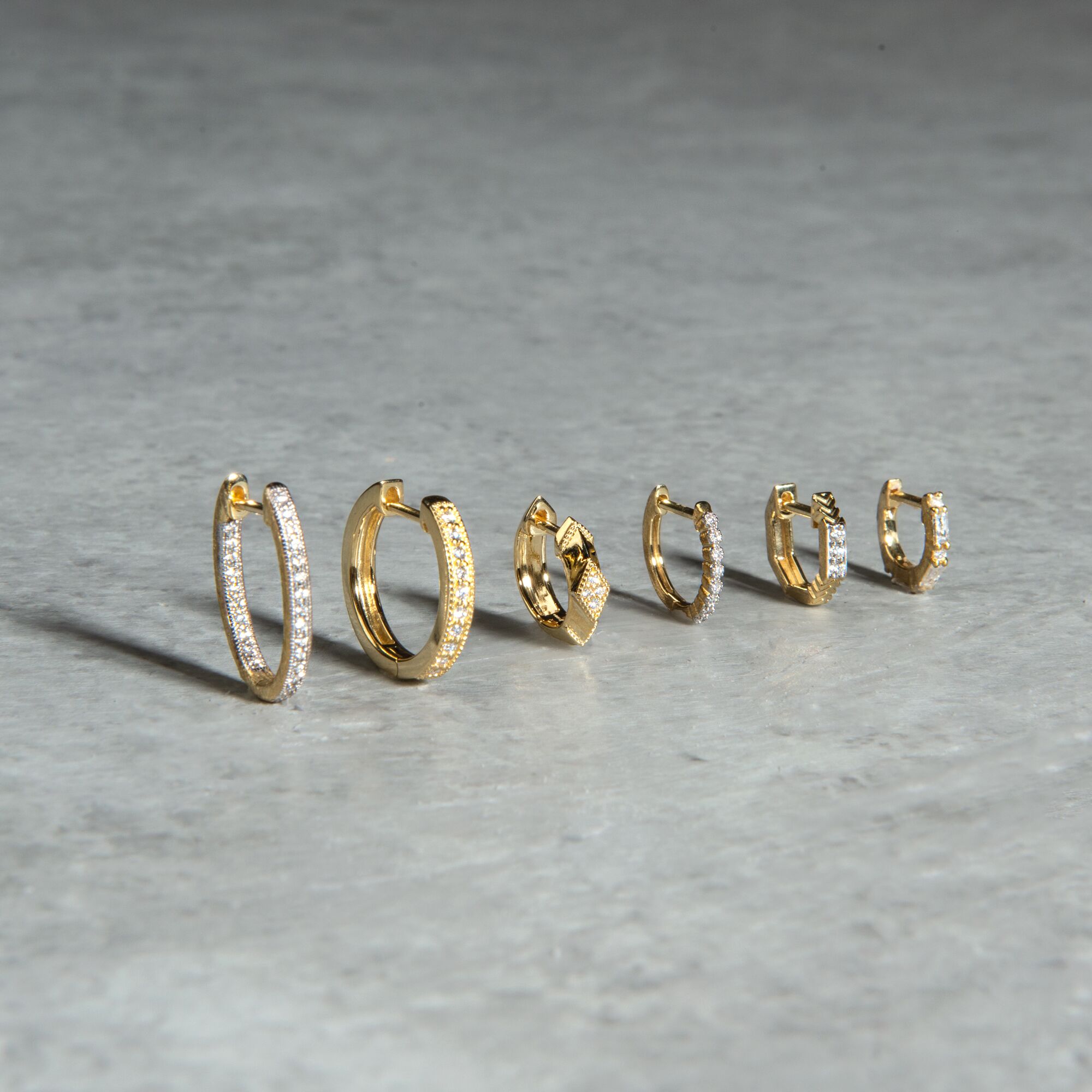 From the Lisse Collection, the Lisse Four Diamond Kite Hoop Earrings feature four white diamonds shaped like a kite, set in 18k yellow gold with the signature brushed high polish JFJ finish.