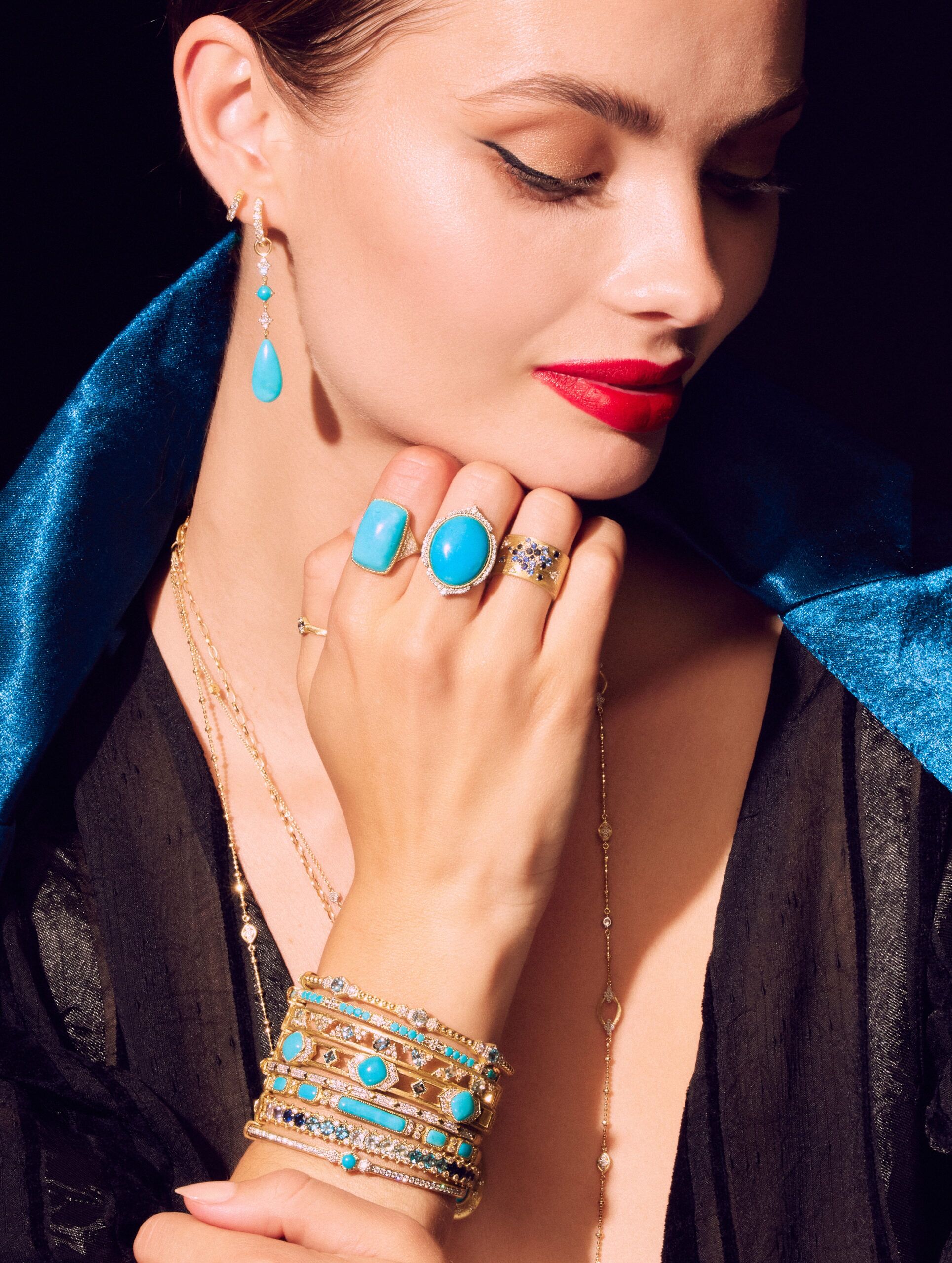 From the Lisse Collection, the Lisse Cushion Cut Cabochon Turquoise Ring features a bold statement turquoise stone trimmed in 18k yellow gold beaded detail with a shank that is set with twenty four total white diamonds. This ring is a perfect cocktail ring to make a statement with.