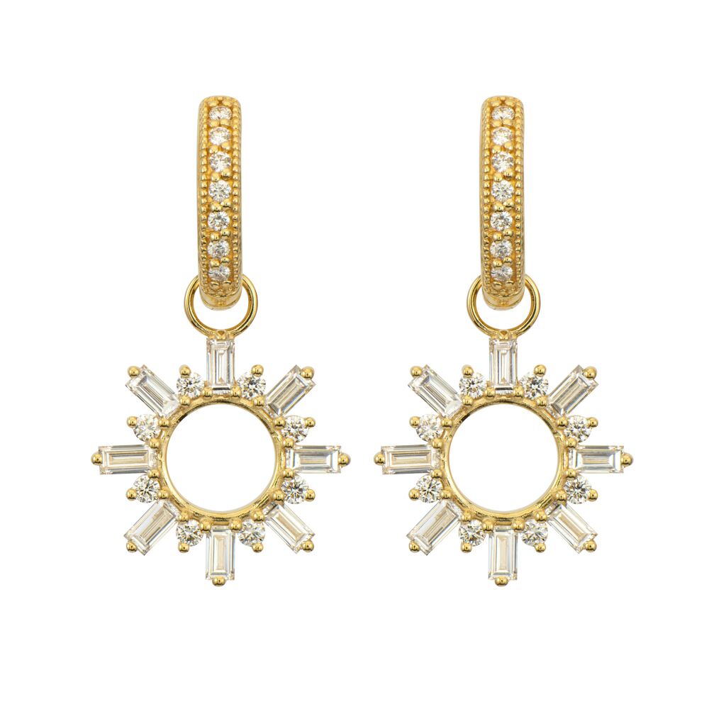 From the Lisse Collection, the Lisse Diamond Baguette Sunburst Earring Charm features an assortment of white diamond baguettes in varying lengths creating a sunburst design set in 18k gold. Hoops sold separately.