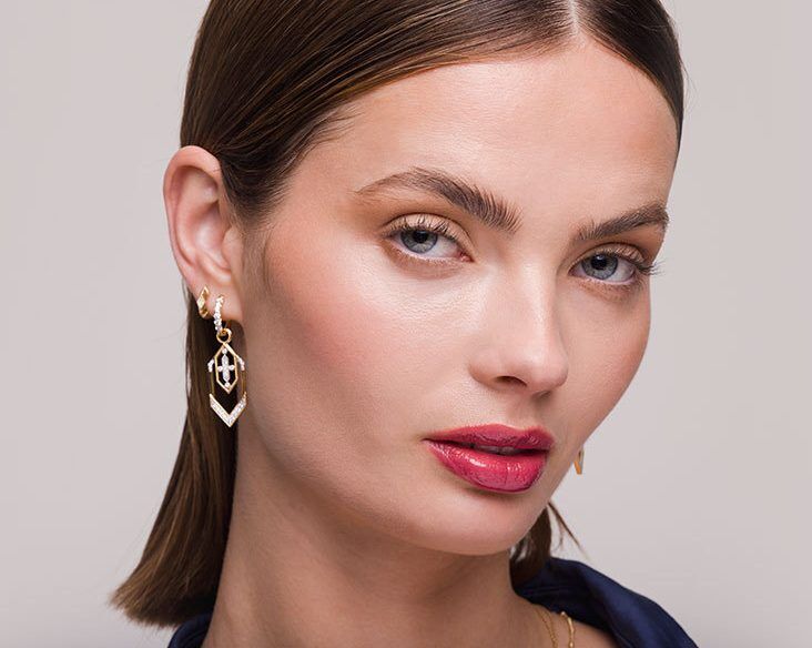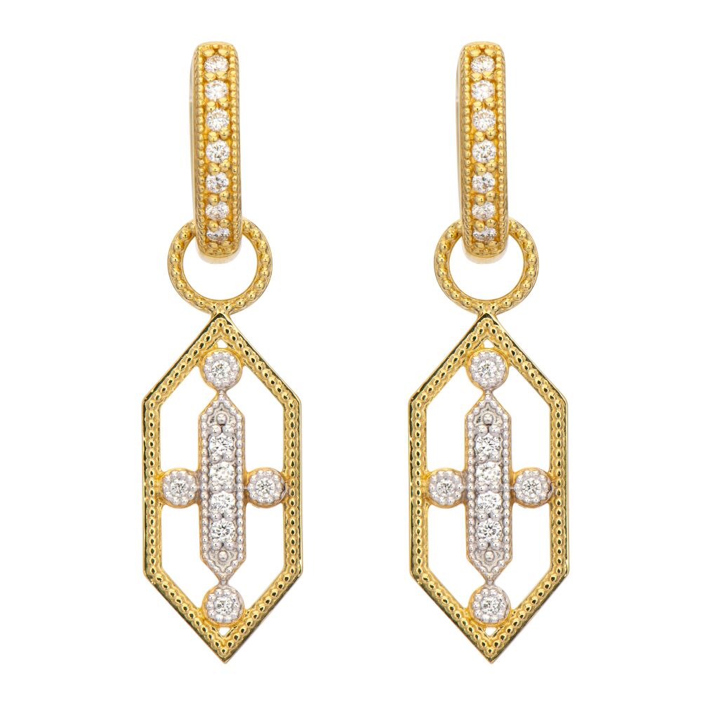 From the Lisse Collection, the Lisse Open Elongated Hexagon features an open hexagon frame with a vertical row of white diamonds in the middle and round white diamond accents in 18k yellow gold. Hoops sold separately.
