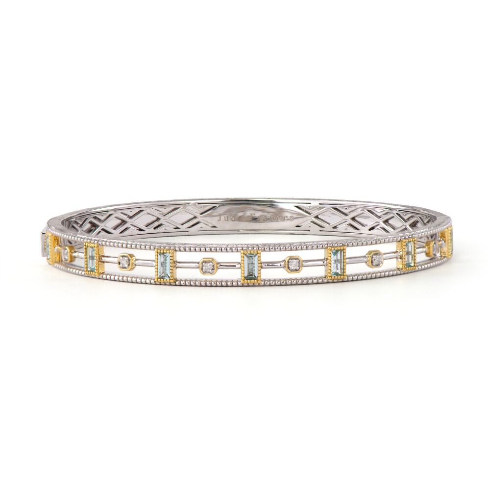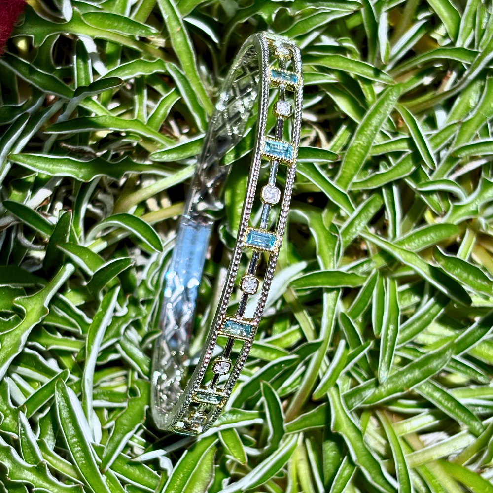 From the Mixed Metal Collection, the Swiss blue topaz baguette stones remind us of the stunning ocean blue colors. These features aligned the milgrain edge with an accent of yellow gold with square white diamonds. Designed with a push-button closure.