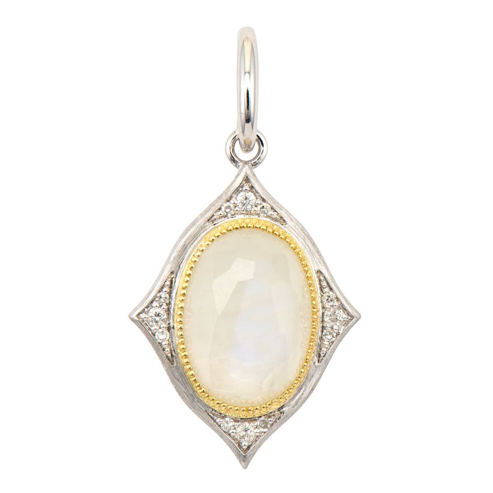 From the Mixed Metal Collection, the Mixed Metal Moonstone Pendant features a large cabochon moonstone on a sterling silver ornamental shape set with rounded white diamonds on the top, bottom, and sides. This pendant is made with yellow gold trim detail. Chain is sold separately.