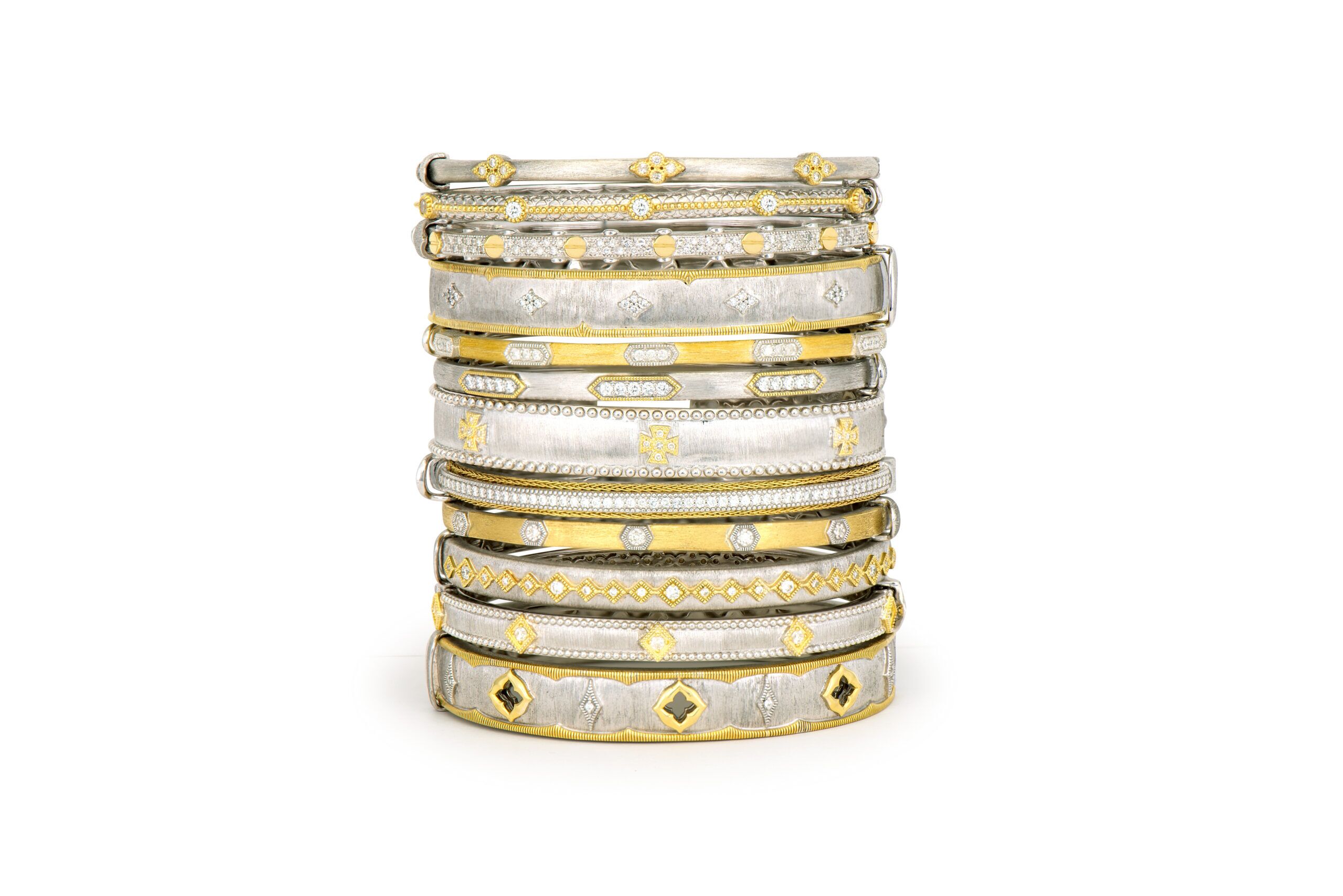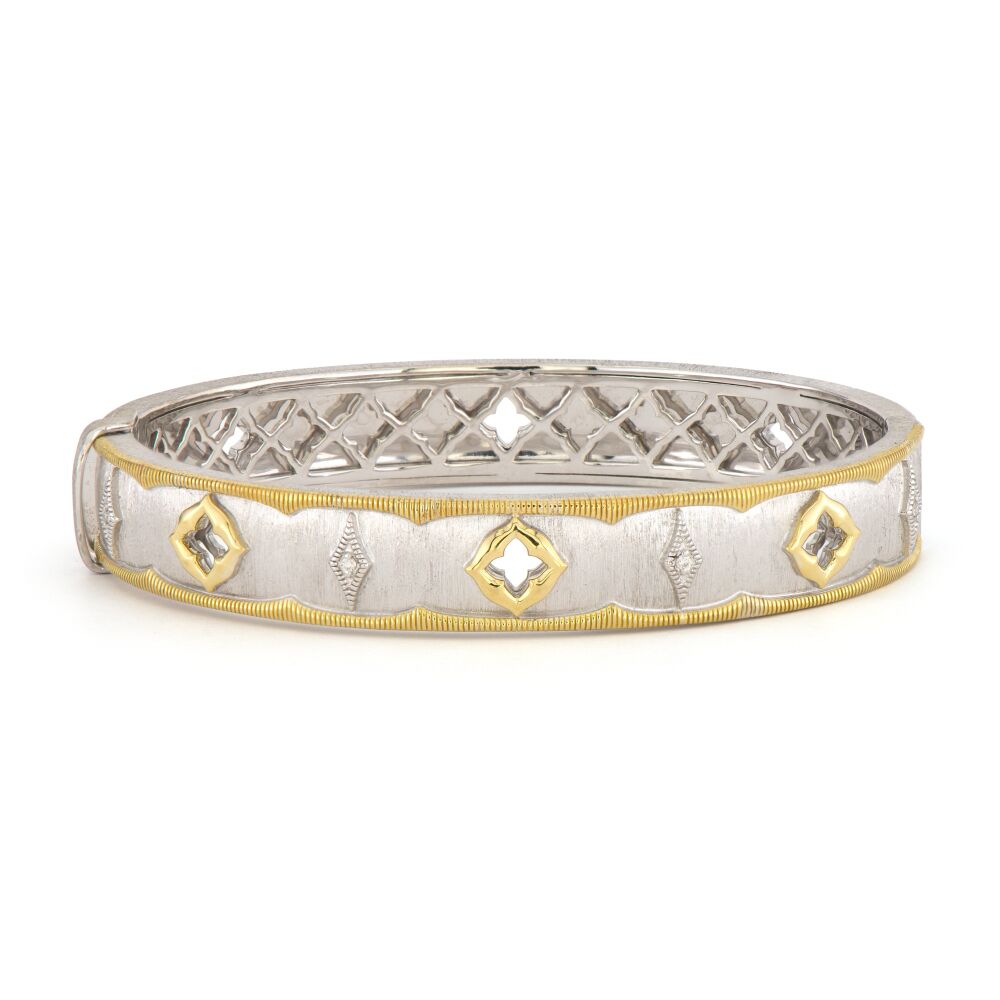 From the Mixed Metal Collection, the Mixed Metal Ogee Bangle features open ogee shaped cut outs in 18k yellow gold high polish finish and alternating elongated white diamond kites on a sterling silver band in the signature brushed JFJ finish with yellow gold milgrain detail along the top and bottom.