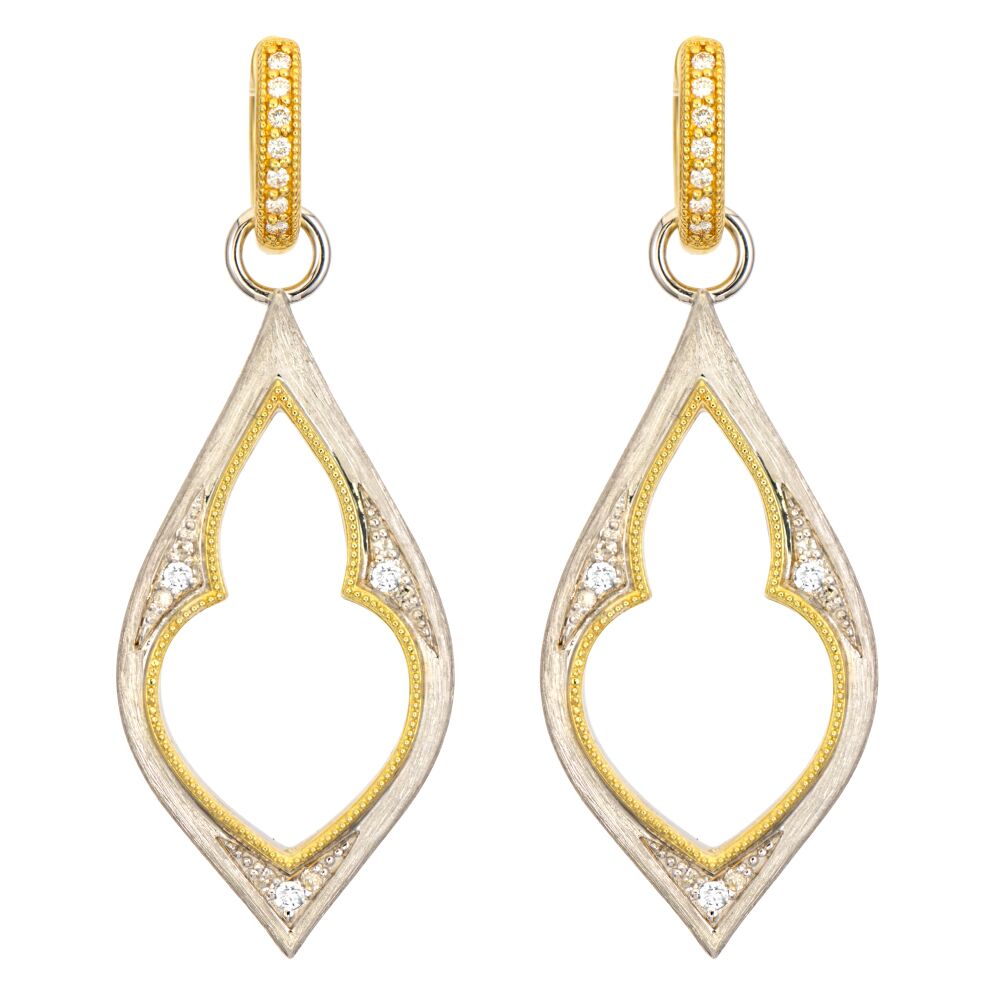From the Mixed Metal Collection, the Mixed Metal Open Shape Earring Charms are a larger pear-shaped charm with an open cut out in the center featuring white diamonds and gold trim on sterling silver.