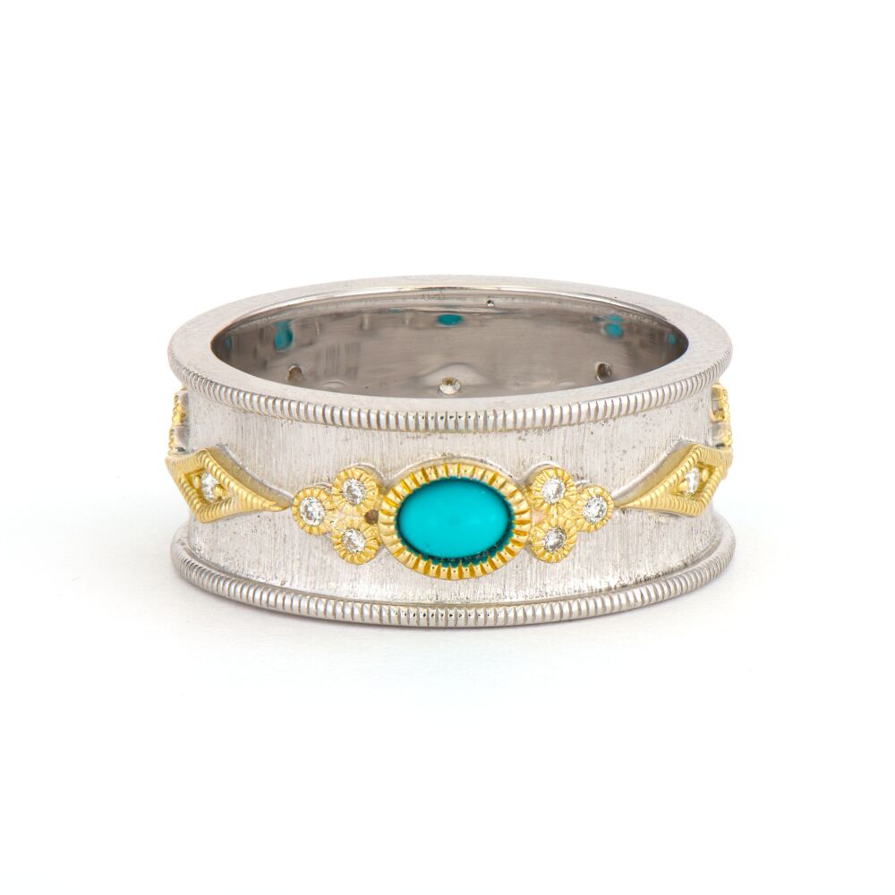From the Mixed Metal Collection, the Mixed Metal Turquoise Cigar Band Ring features a cabochon turquoise stone with diamond trios on each side and kite detailing in 18k yellow gold . This ring features milgrain detail on a sterling silver band brushed with the signature JFJ finish.
