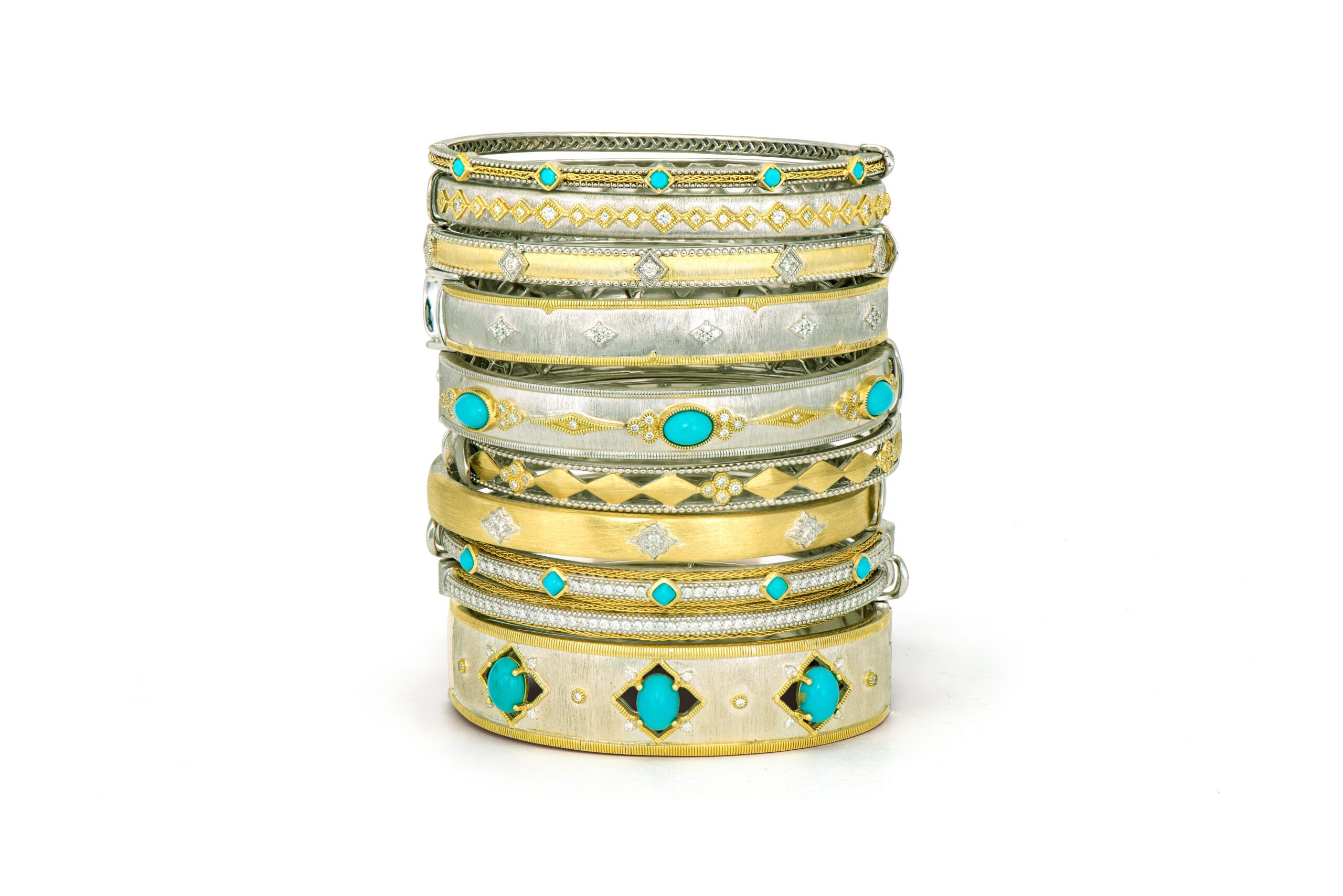 From the Mixed Metal Collection, the Mixed Metal Turquoise Bangle features three cabochon turquoise gemstones with white diamond trios on both sides and elongated white diamond kites in 18k yellow gold trim on a sterling silver band set in the signature brushed JFJ finish.