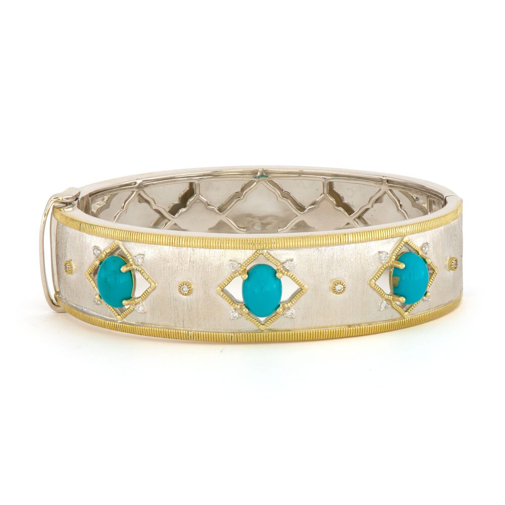 From the Mixed Metal Collection, the Mixed Metal Wide Band Bangle Features Three Large Turquoise Gemstones in an open cut out and small round white diamonds on a wide sterling silver bangle with 18k yellow gold milgrain detail.