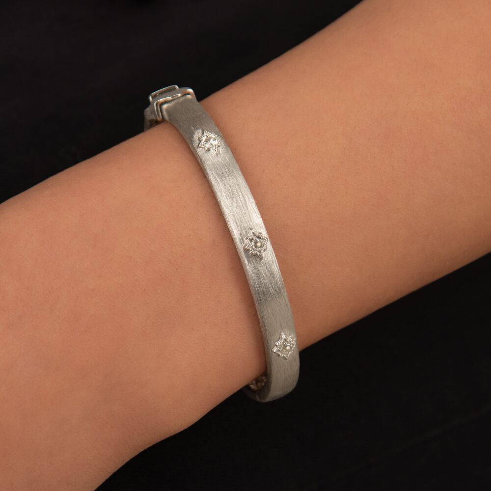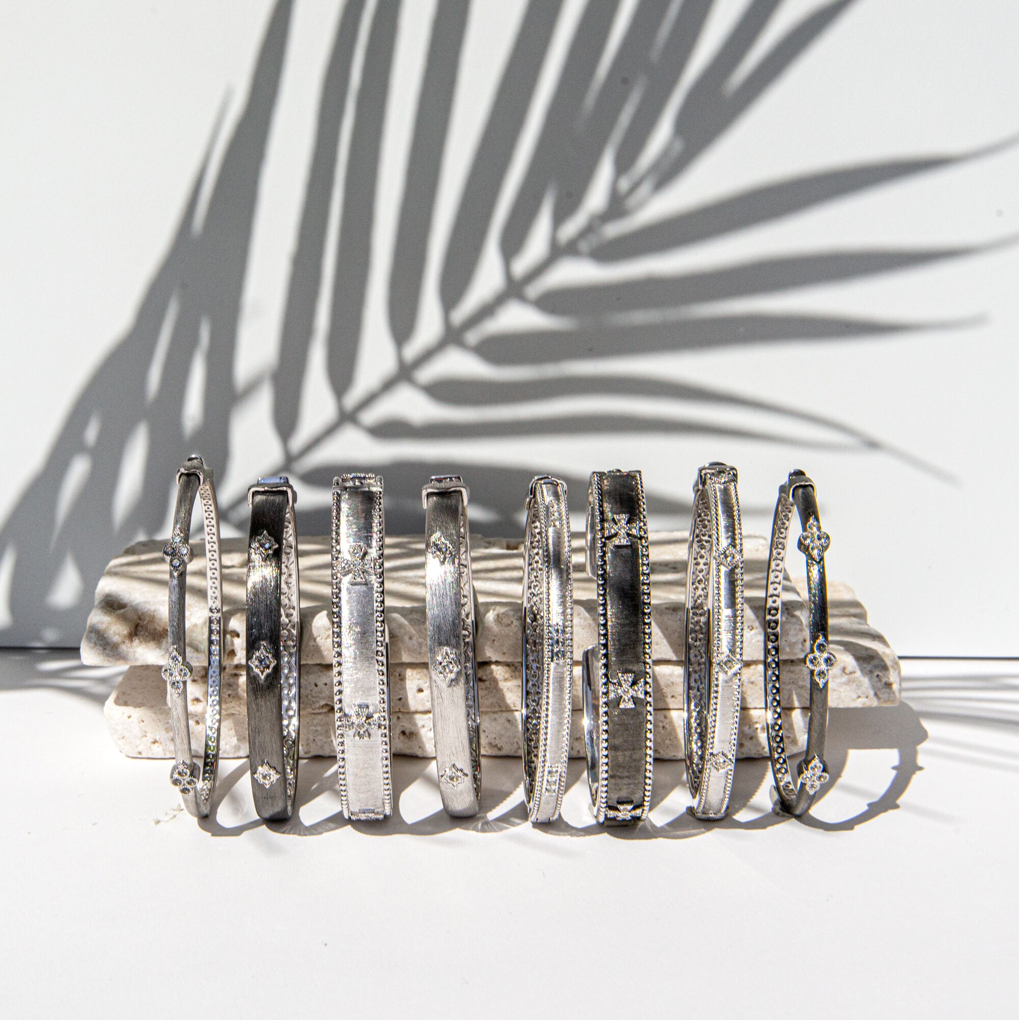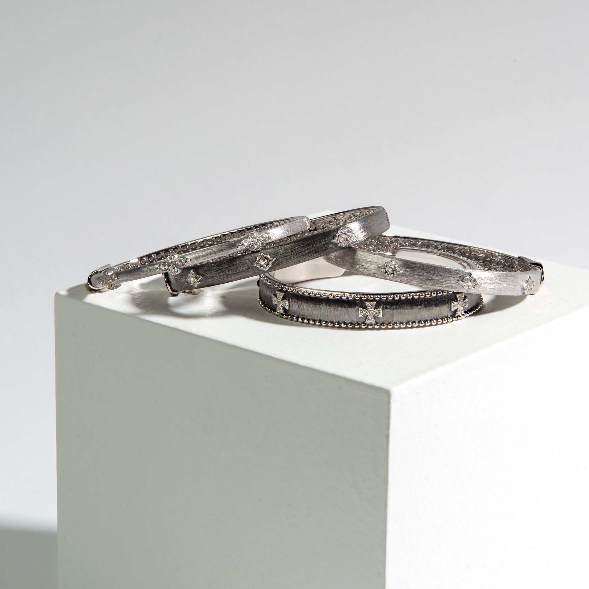 From the Moroccan Collection, the Moroccan Star Wide Bangle features features the signature brushed JFJ finish in a soft brushed texture with stars set into the band that adds some sparkle.
