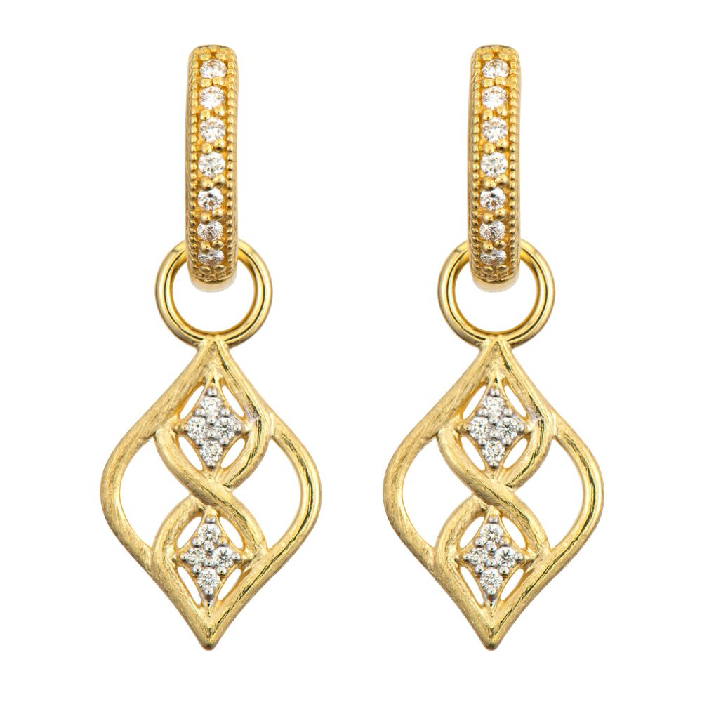 From the Moroccan Collection, the Moroccan Marquis Earring Charms feature an open ornamental design with white diamonds in the center in the signature brushed JFJ finish in 18k yellow gold. Sold as a pair. Hoops sold separately. Description and details reflect half a Charm.