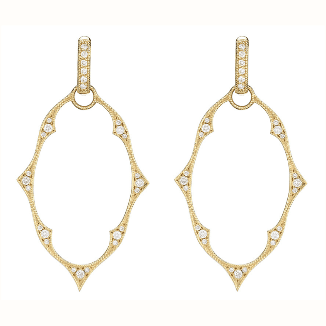 From the Moroccan Collection, the Moroccan Earring Charm frames feature an intricate design crafted in 18k gold with an open center, designed adorn with a JudeFrances earring charm. Hoops sold separately.