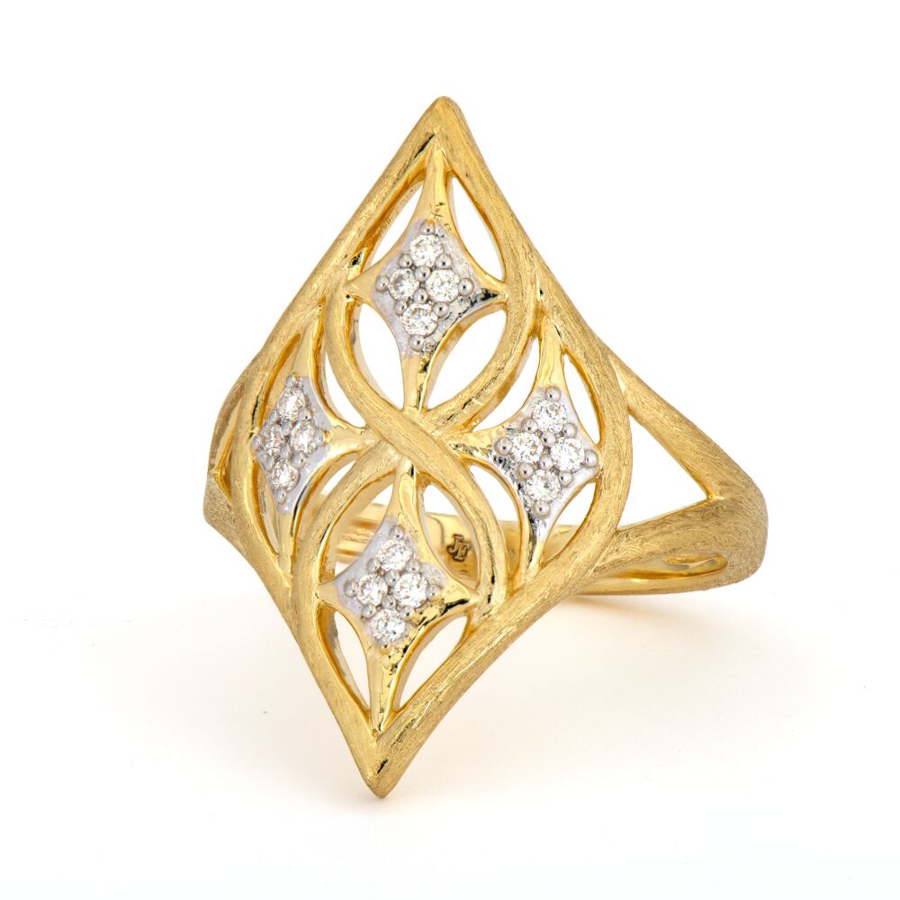 From the Moroccan Collection, the Moroccan Gold Wirework Ring features four sets of four white diamonds in the center of an open framework design in 18k yellow gold brushed in the signature JFJ finish.