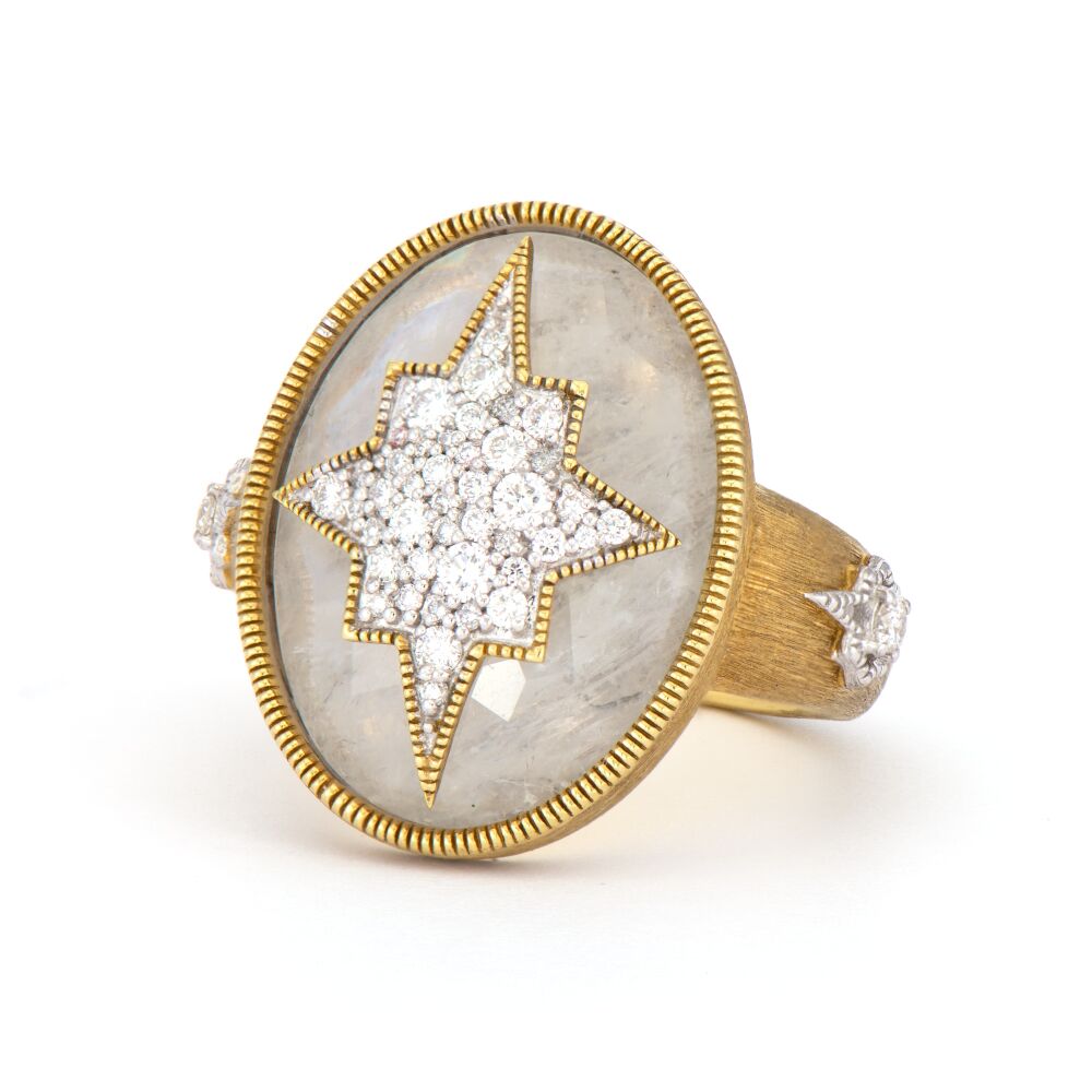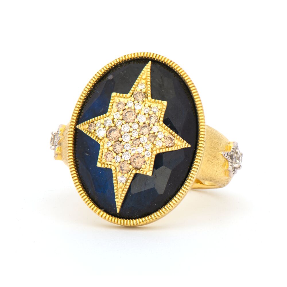 From the Moroccan Collection, the Moroccan Large Stone Pave Diamond Star Burst Cocktail Ring features pave diamonds in a center star design set in 18k yellow gold.