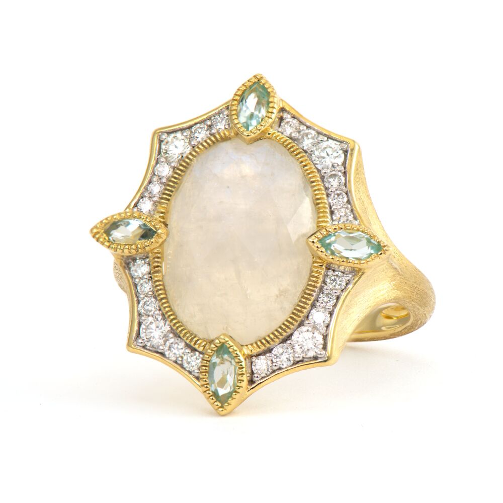 From the Moroccan Collection, the Moroccan Moonstone Ring features an oval moonstone gemstone in the center, embraced by an intricate outline of round white diamonds, and adorned with a sky blue topaz marquise carefully positioned on the top, bottom and sides, set in 18k yellow gold.
