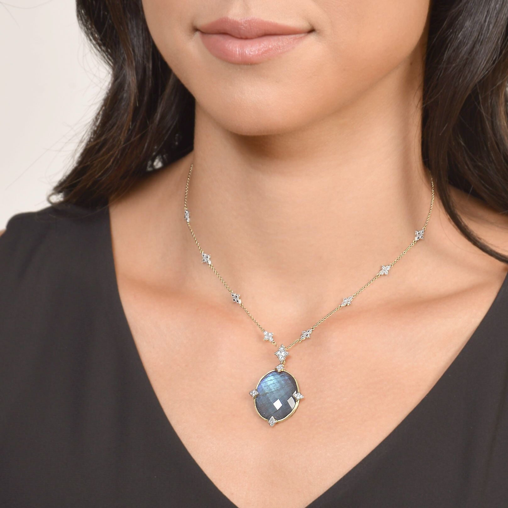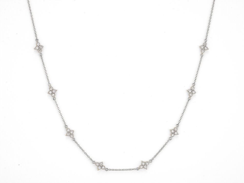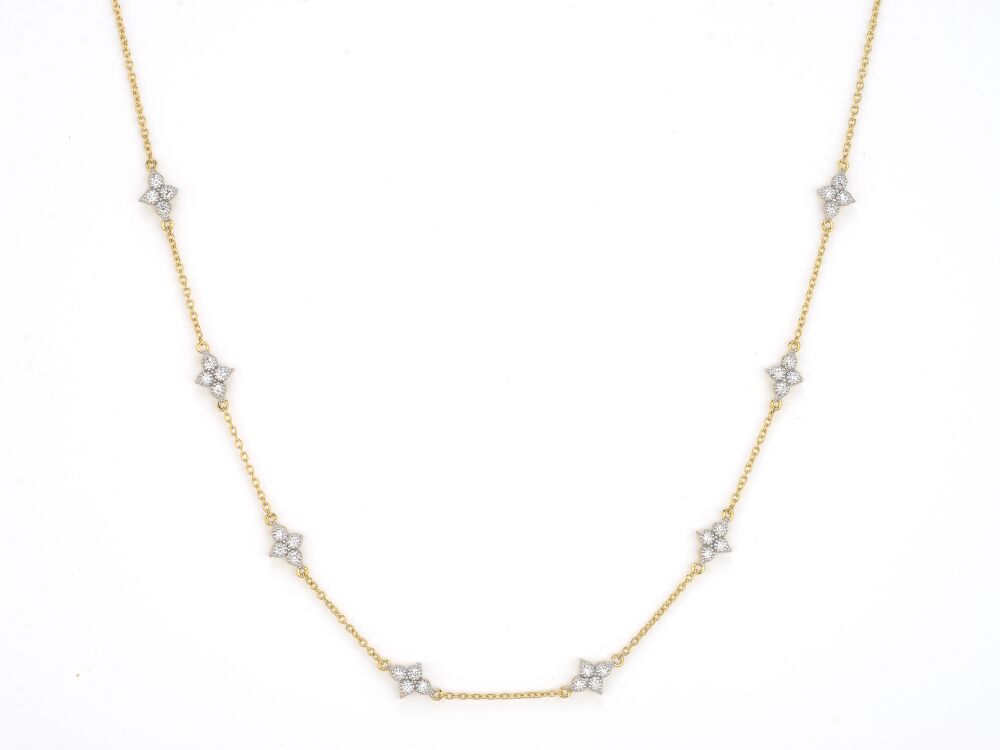 From the Moroccan Collection, the Moroccan Quad Diamond Station Necklace features 18K gold with bezel set round diamonds and the signature brushed JFJ finish on a Boston chain. Chain is 18 inches.