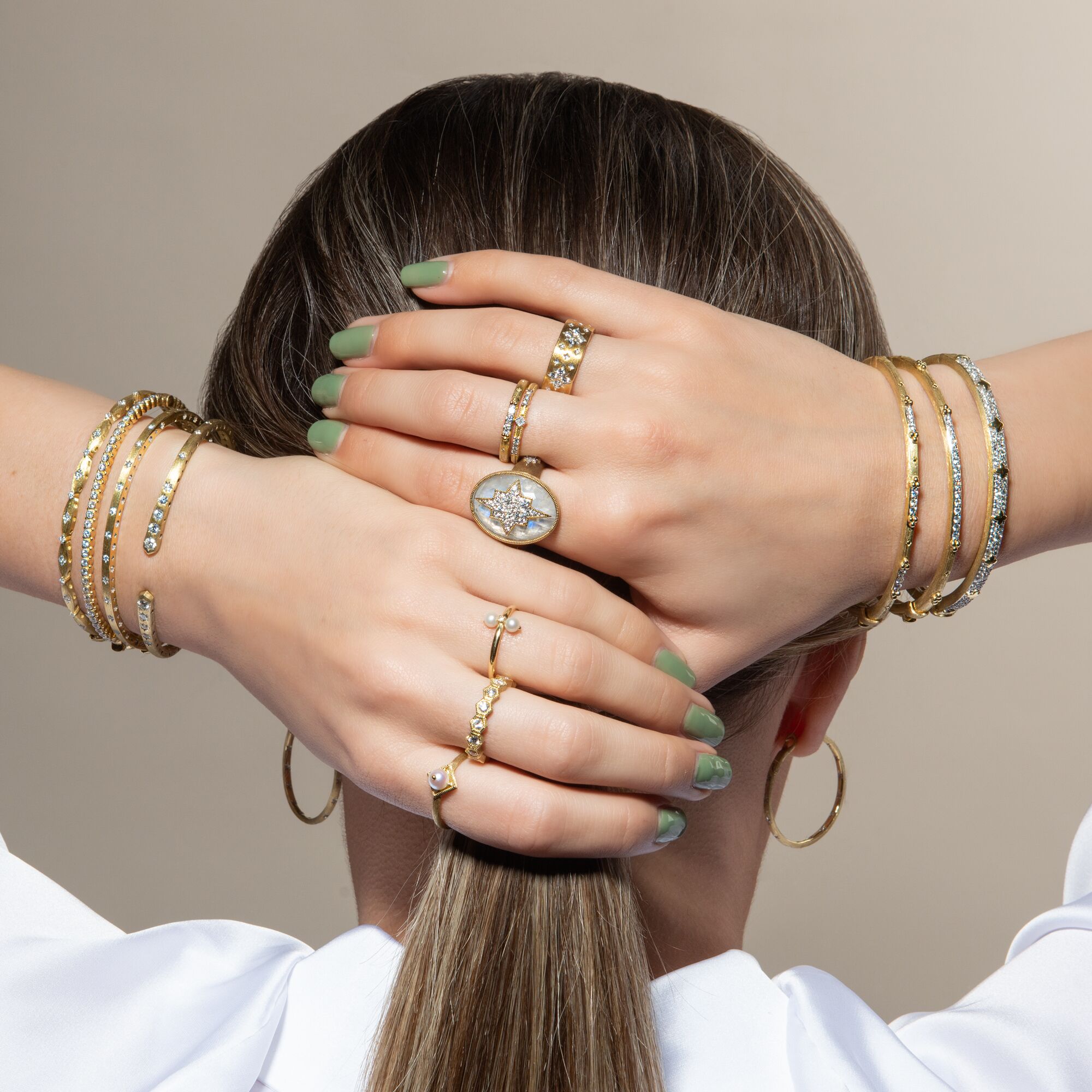 From the Moroccan Collection, the Moroccan Rose Cut Diamond Hexagon Band is a perfect addition to a ring stack or even worn solo. This ring features a continuous band of diamonds in 18K yellow gold hexagons to elevate the shape.