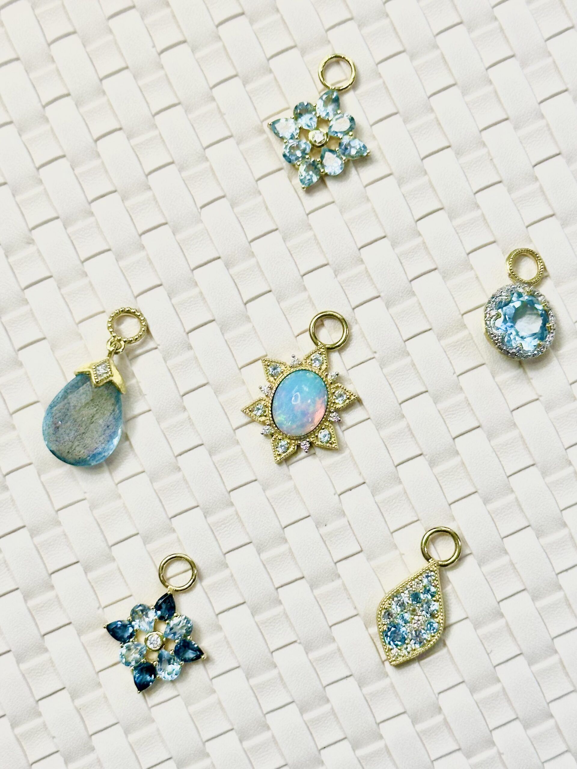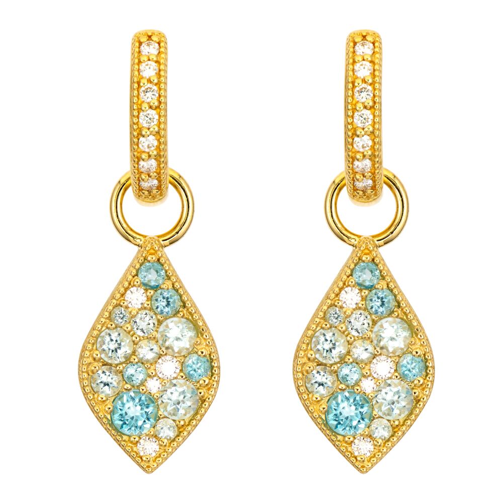 From the Provence Collection, the Provence Pear Shaped Earring Charms feature round sky blue topaz, green amethyst, and white diamonds in varying sizes on a pear shaped body in 18k yellow gold. Hoops sold separately.