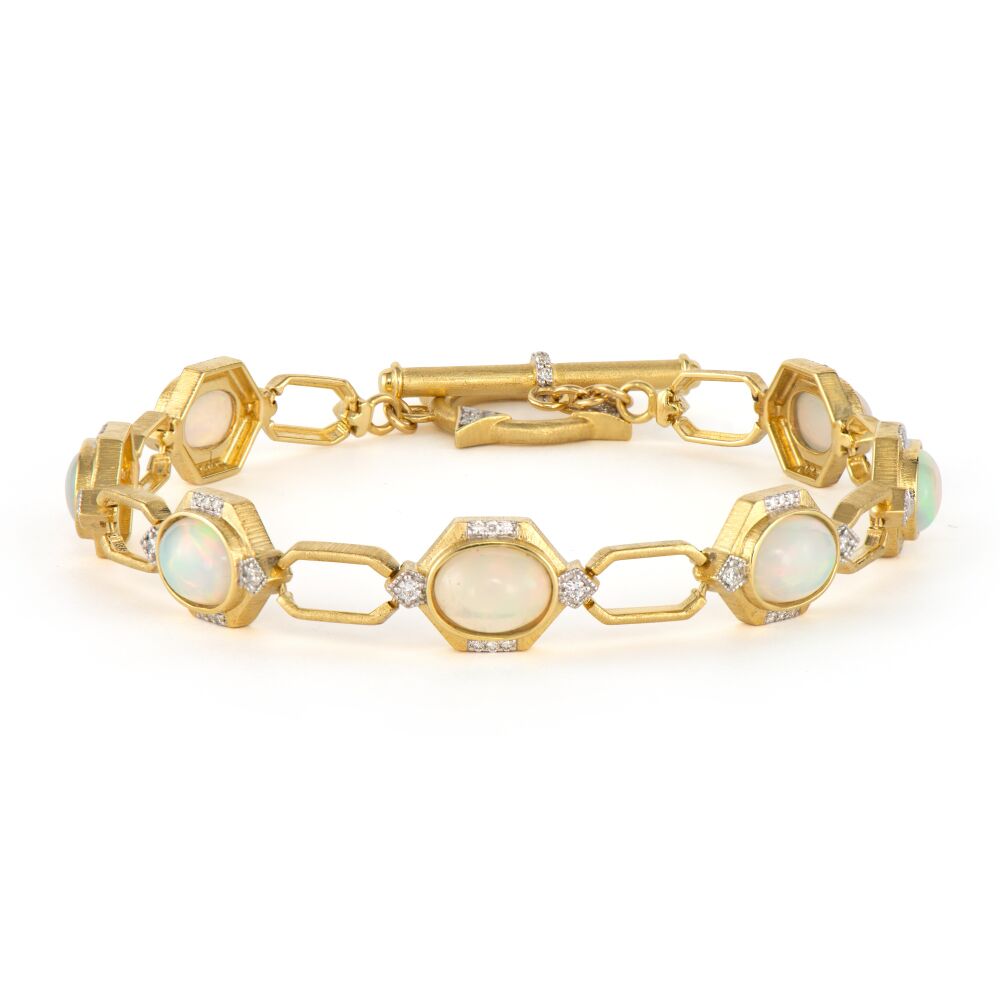 From the Lisse Collection, the soft link opal bracelet features six opals with a bar and toggle clasp with white diamonds set into the 18k yellow gold. This comes in two lengths size 6.5 seen here and size 7.
