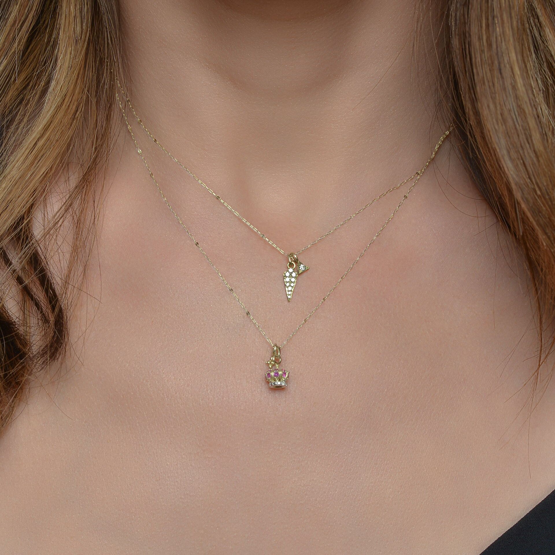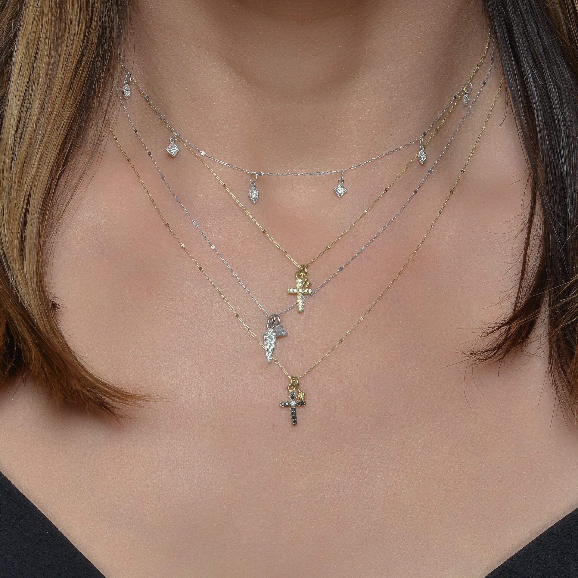 From the Petites Collection, the Petite Pave Diamond Dagger Pendant with Hanging Diamond Trillion features bezel set White Diamond set in 18K gold. The delicate link chain, offers a sliding adjustable closure with 18K white gold trillion on the end.