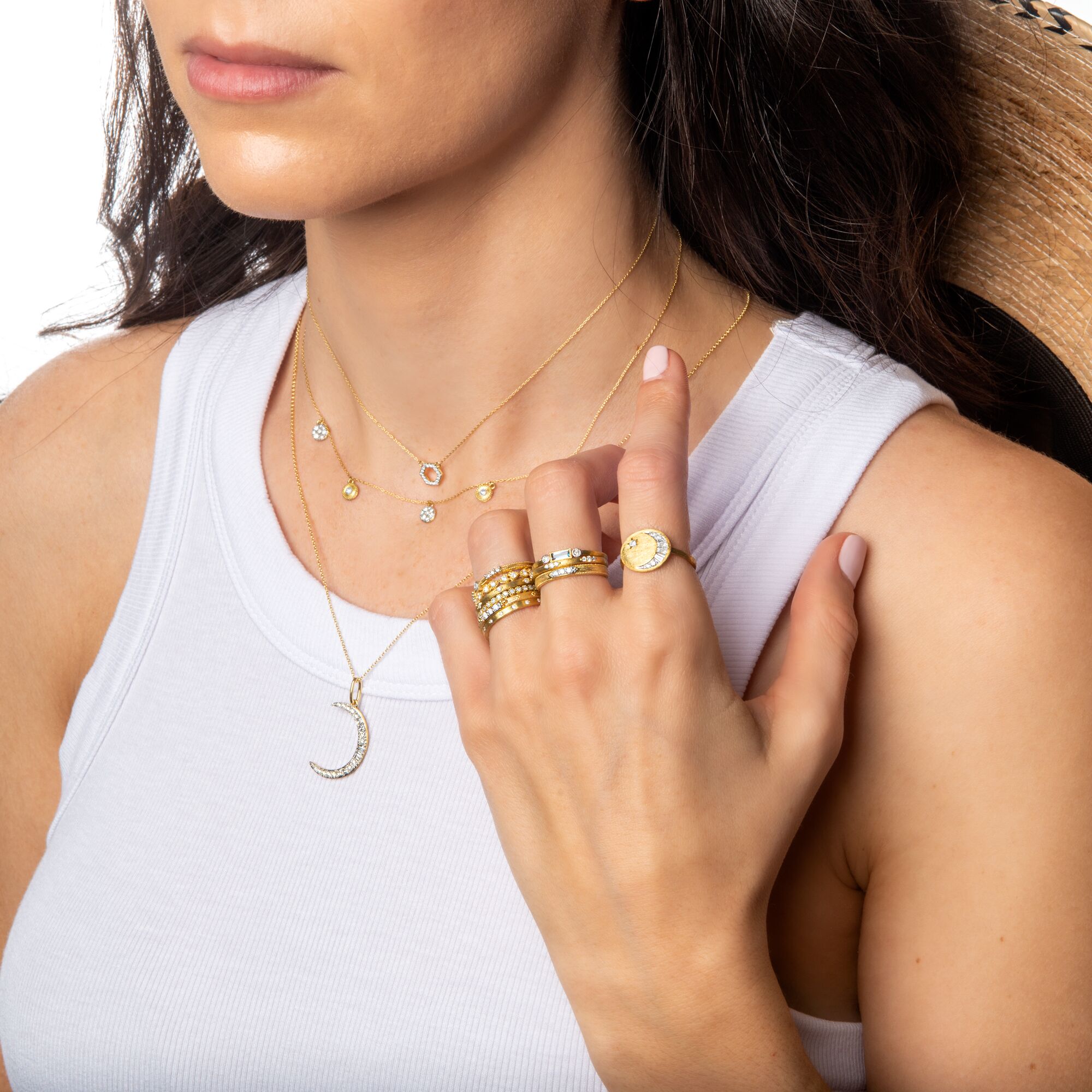 From the Petites Collection, the Petite Crescent Moon Necklace features a crescent shaped moon pendant filled with white diamonds in 18k yellow gold on a 20 inch chain.