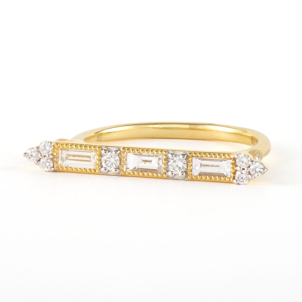 From the Provence Collection, the baguette bar ring features three stunning stones set between white diamond trio stones. This is the bar ring you will dream about.