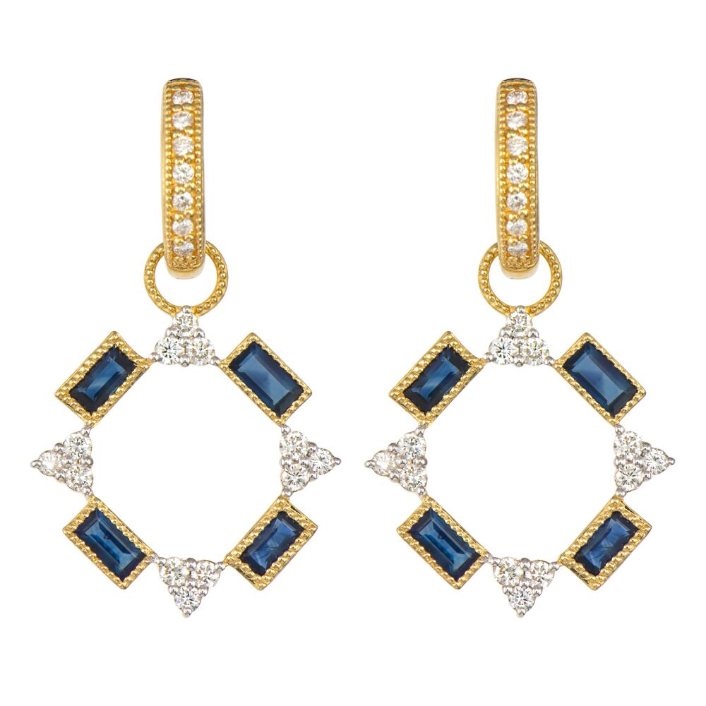 From the Provence Collection, the trio baguette two-stone charm features alternating blue sapphire baguettes with trio cluster white diamonds. 18k yellow gold features the JF signature brushed finish. Hoops are sold separately.