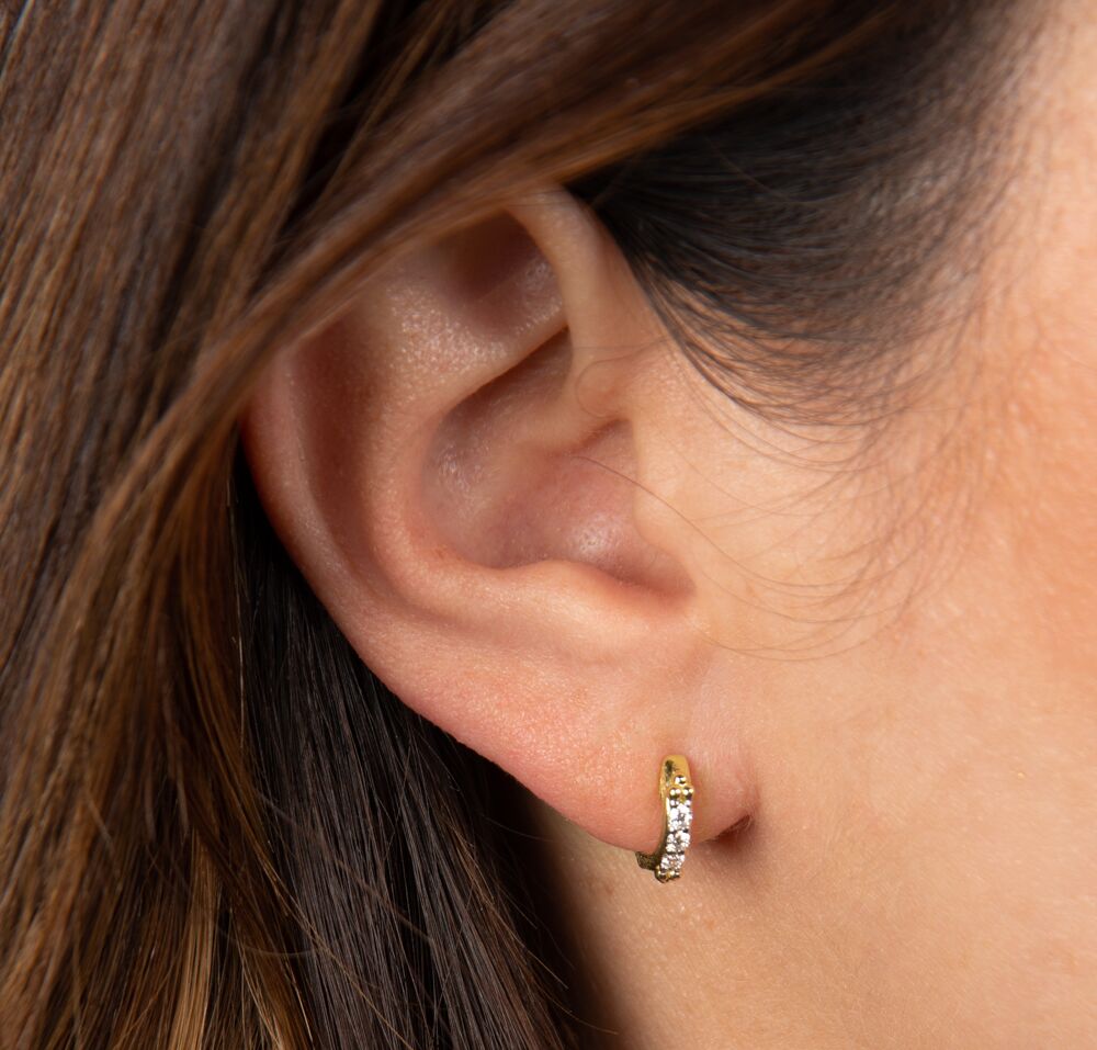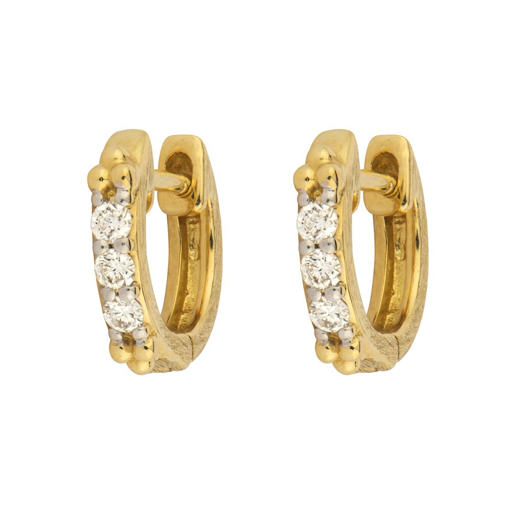 From the Provence Collection, the Ella Three Stone Diamond Hoop Earrings feature a top trio shape set between three white diamonds with the 18K yellow gold and the signature brushed JFJ finish. This is a small everyday hoop.