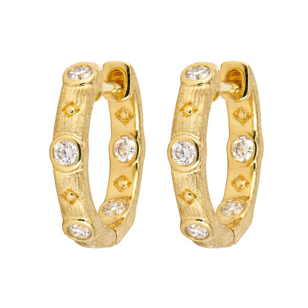 From the Provence Collection, the Jane Hoop Earrings with Diamonds Inlay feature round white diamonds set between small triangles in 18k yellow gold signature brushed JFJ hoop. This is a small everyday hoop