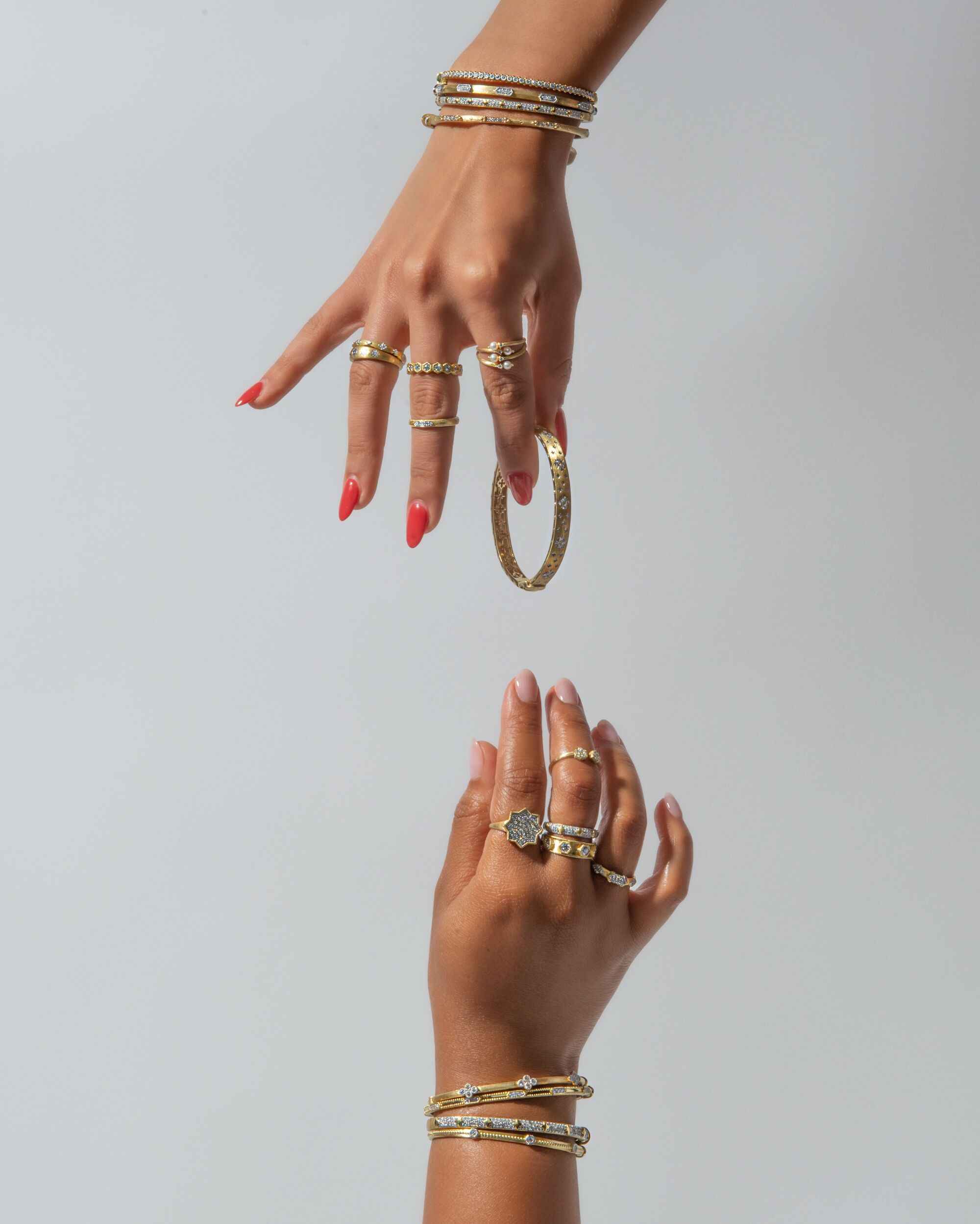 From the Provence collection, the Provence Beaded Trimmed Bangle with Pave White Diamonds features three pave white diamonds interconnected by a gold beaded trim running through the center of the bracelet set in the signature brushed JFJ finish in 18k yellow gold.