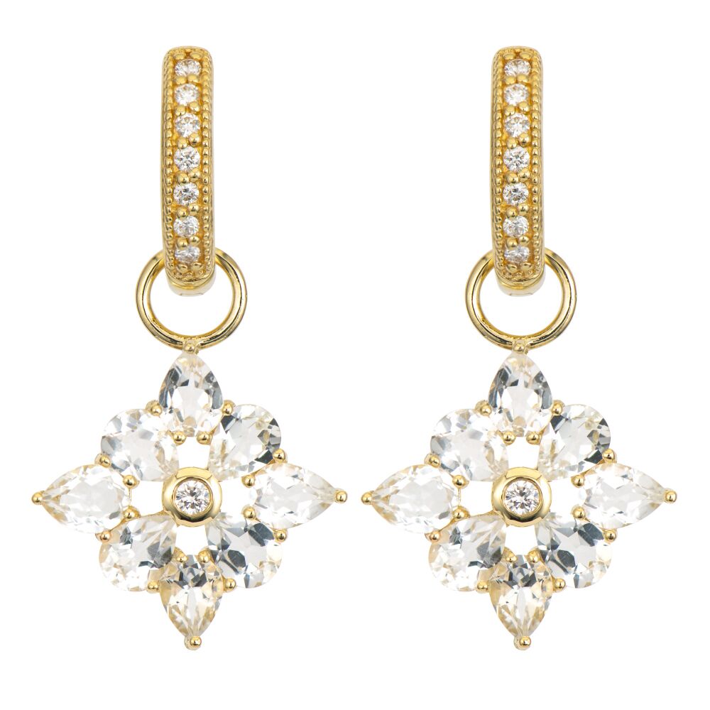 From the Provence Collection, the Provence Four Petal White Topaz Earring Charms features four white topaz petals with four pear-shaped petals set in 18k yellow gold. Hoops sold separately.
