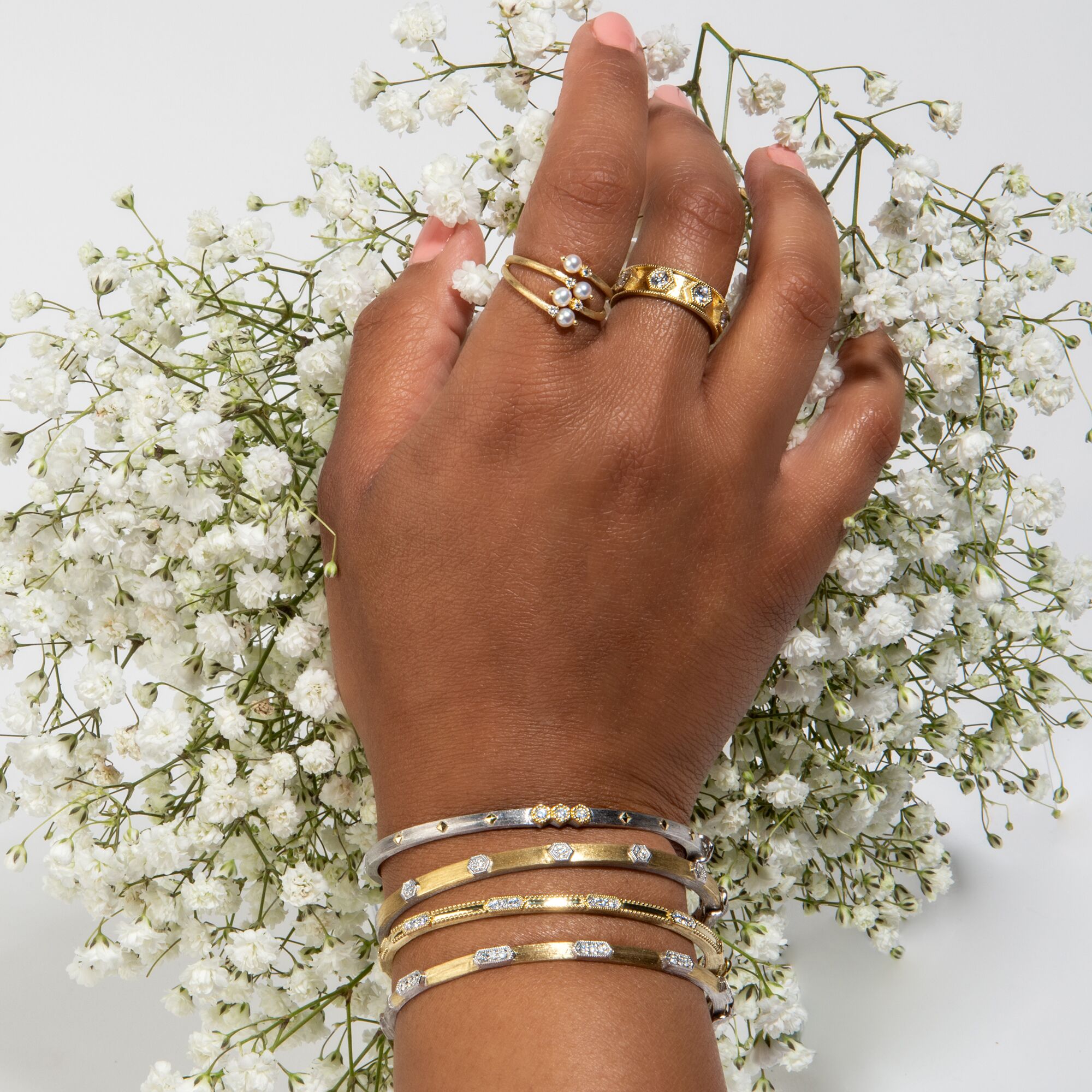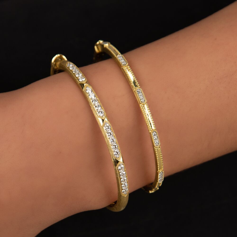 From the Provence Collection, the Provence Elongated Hexagons with Diamonds Bangle features five elongated hexagons with a cluster of three white diamonds in the middle along this 18k yellow gold high polish bracelet with beaded trimmed detail along the edges of the band.