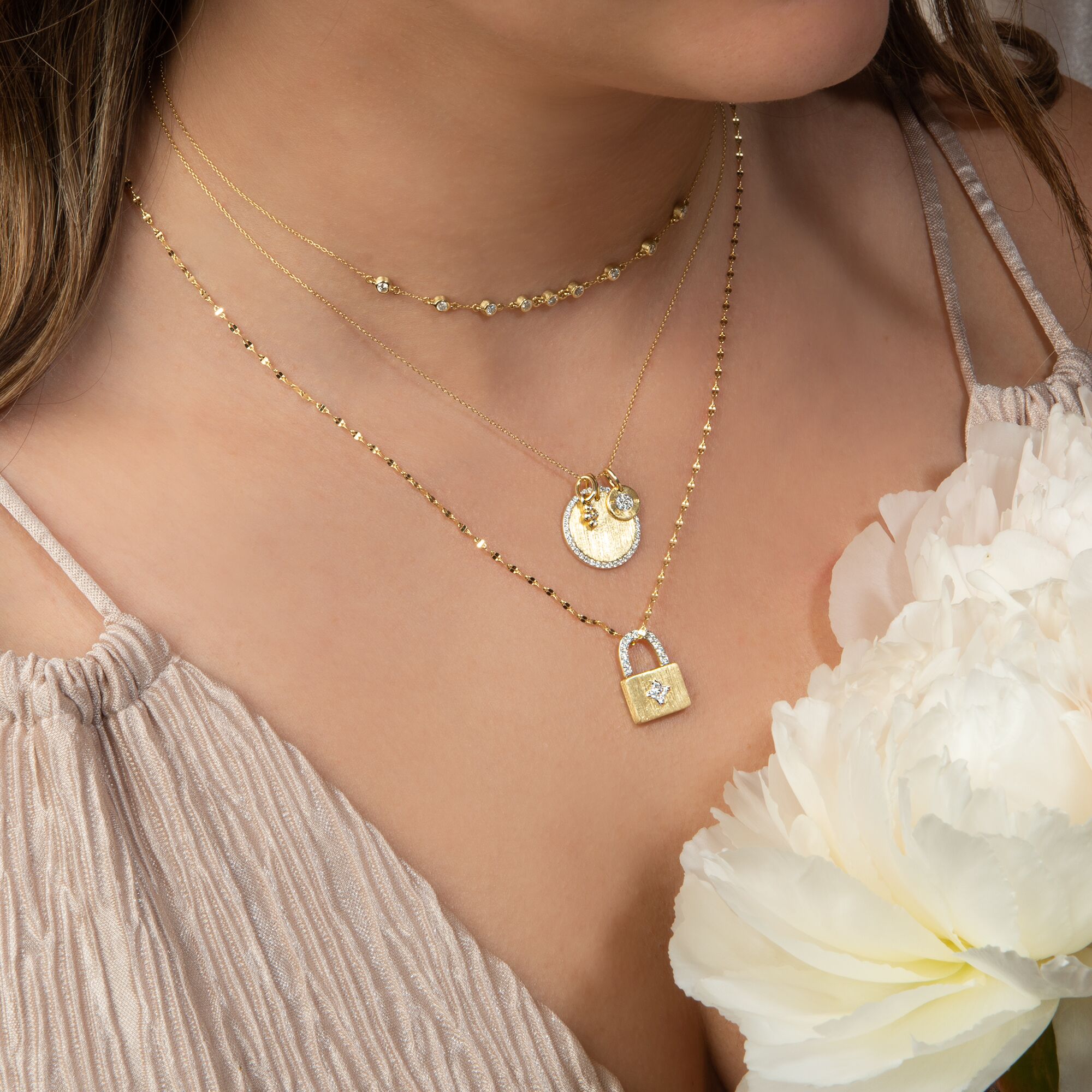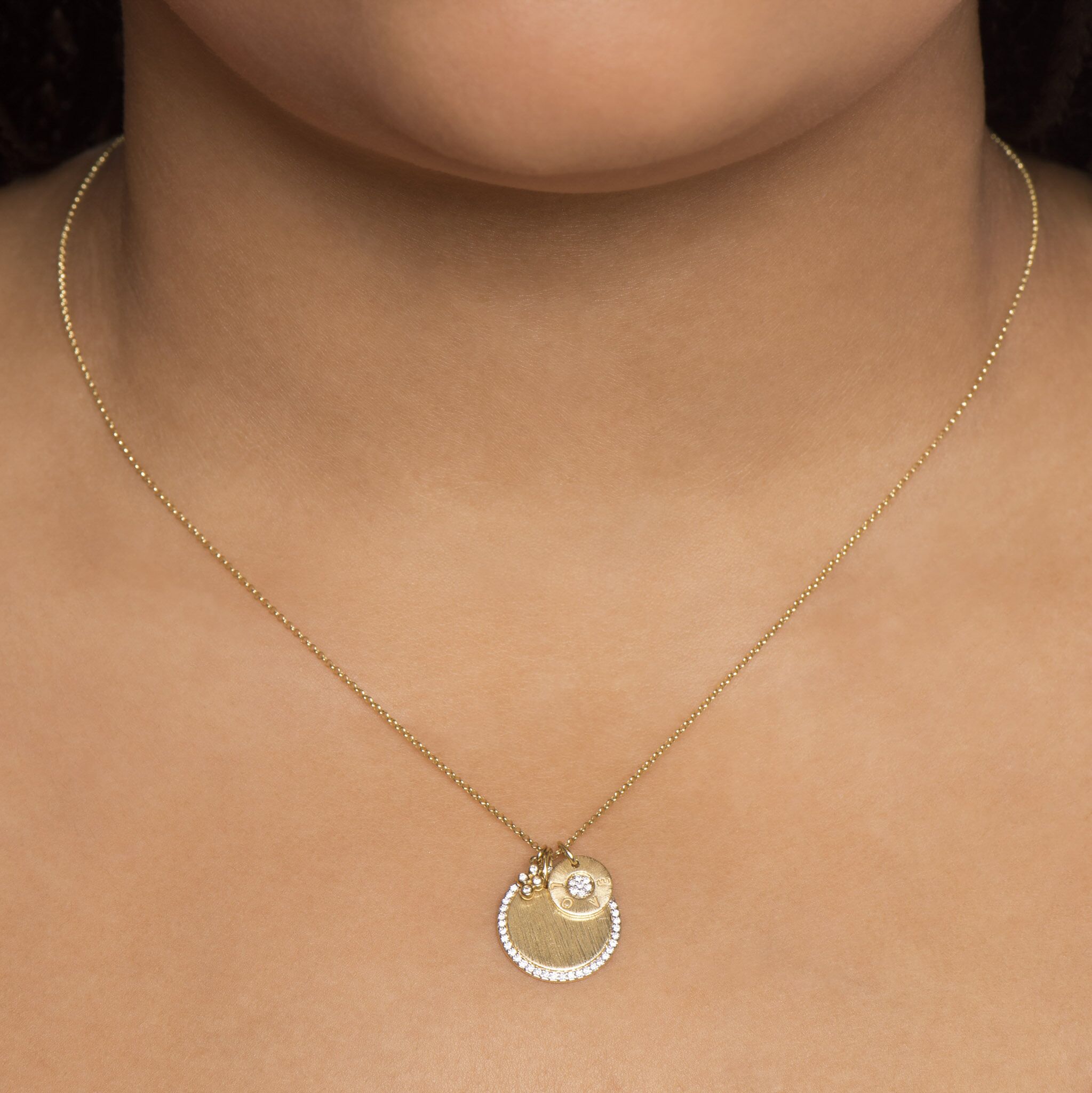 From the Provence Collection, the Provence Pave Disc & Love Disc Pendant features pave round diamonds set in 18K yellow gold with the signature brushed JFJ finish. Pendant accents with a bezel set hanging diamond quad and engraved “LOVE” diamond circle. Chain is 18 inches.