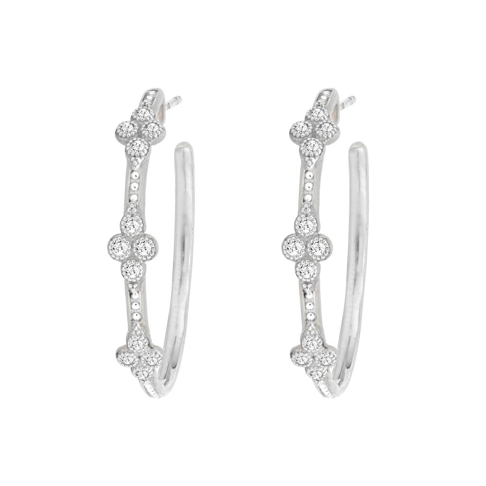 From the JudeFrances Silver Collection, the JudeFrances Silver Medium Moroccan Quad Hoop Earrings feature pave and bezel set white topaz in sterling silver with the signature brushed JFJ finish.