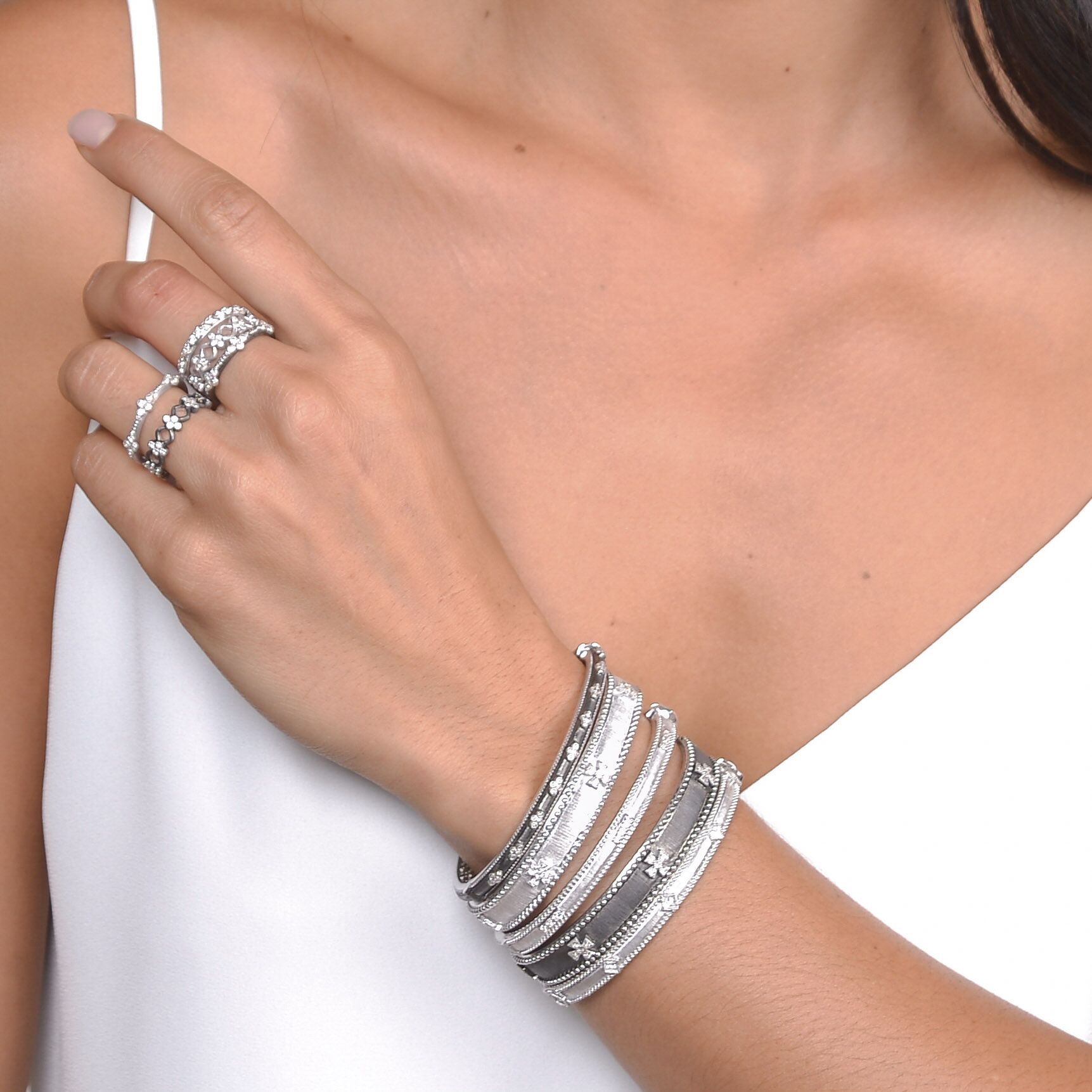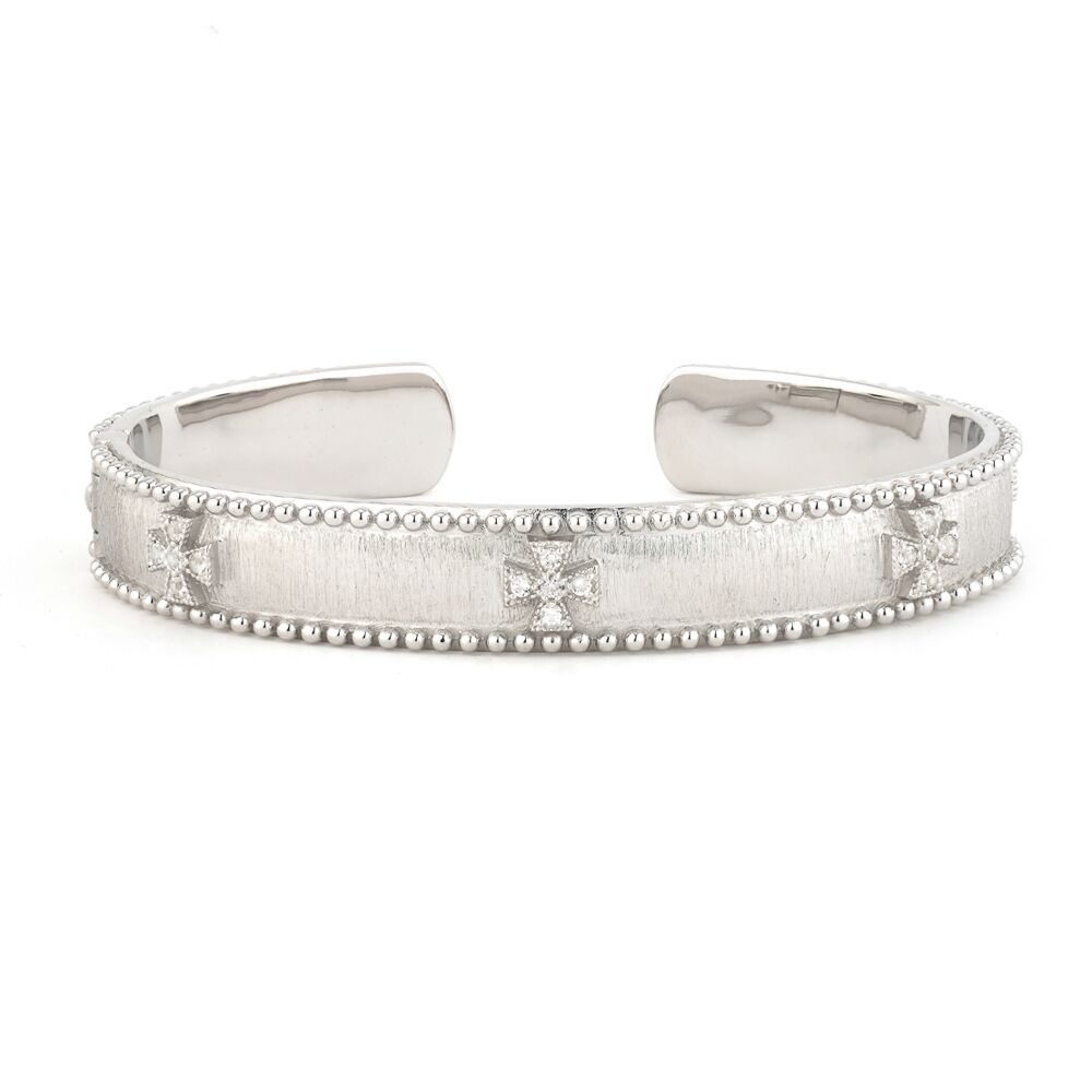 From the Sterling Silver Collection, the Sterling Silver Narrow Beaded Maltese Cuff features round faceted white topaz pave set in sterling silver Maltese crosses and the signature brushed JFJ finish accented with beaded edges.