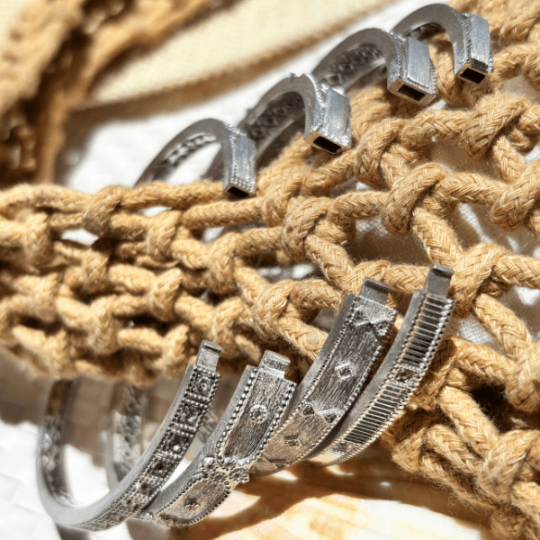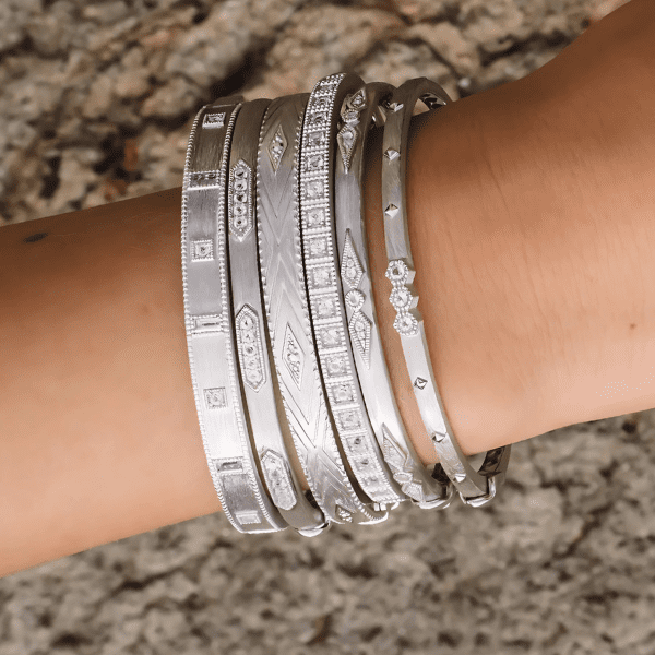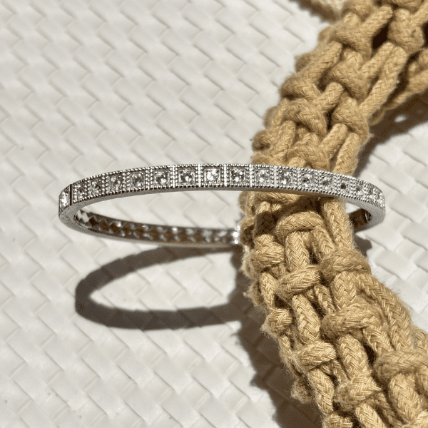 From the Lisse Collection, the Sterling Silver bracelet features white topaz stones set in an eternity pattern with an interior gallery pattern that reminds you of a Roman guard. The design includes the milgrain edge with a push-button closure.