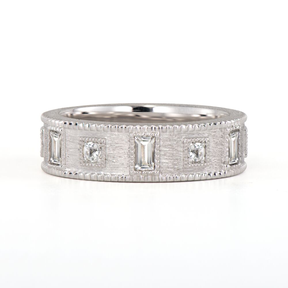 From the Moroccan Collection, the sterling silver ring features alternating square and baguette white topaz stones with the signature brushed JFJ finish.