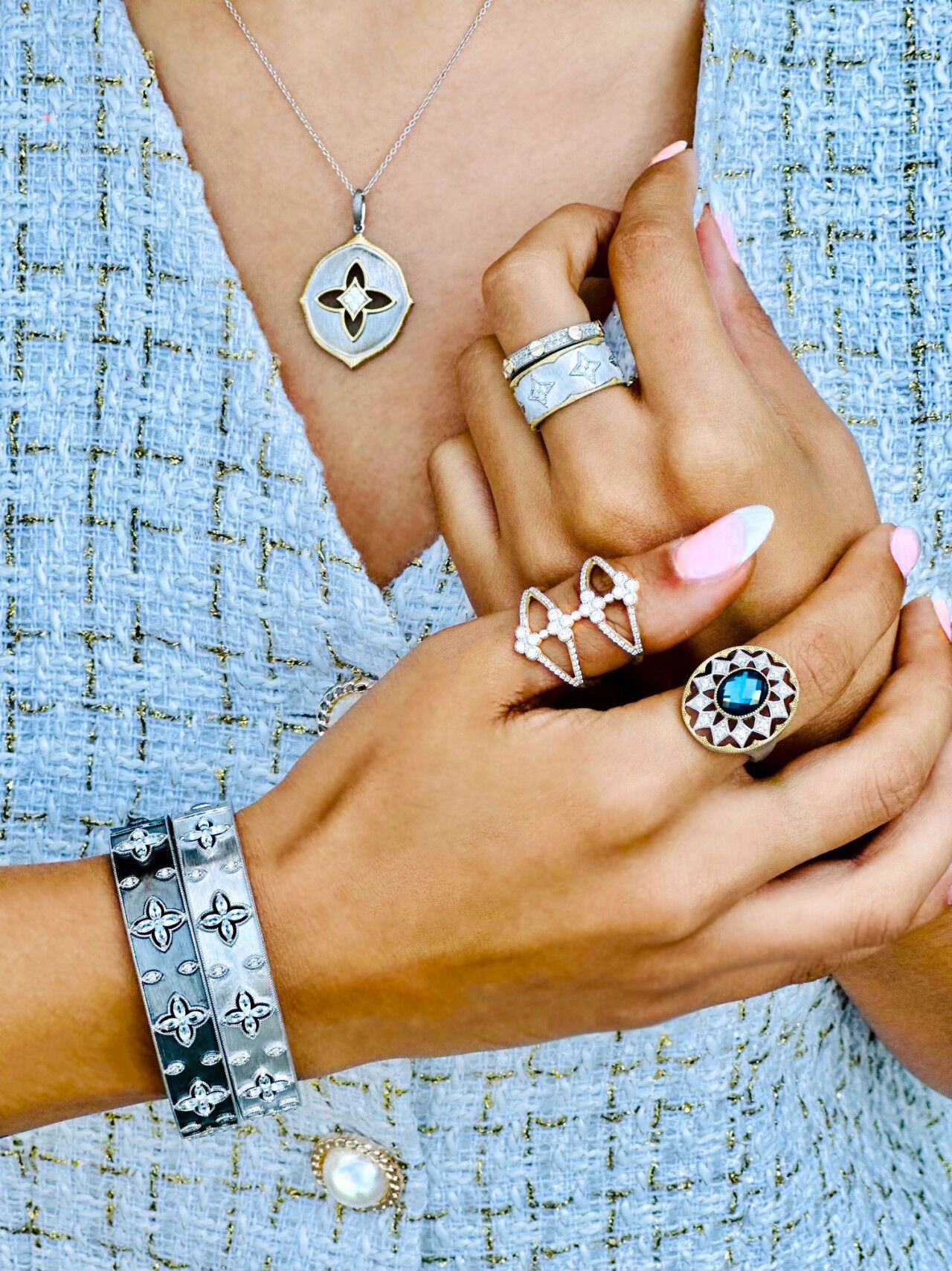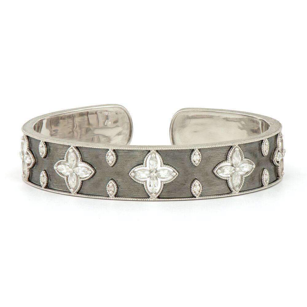 From the Sterling Silver collection, the Silver Moroccan Floral Motif Wide Cuff features five prong set white topaz marquise thoughtfully arranged in an open Moroccan floral frame. Additional white topaz elements adorn the top and bottom edges, set with the signature brushed JFJ finishing in silver. Complete the set with the matching Blackened Silver and White Topaz Hoop and Charms.