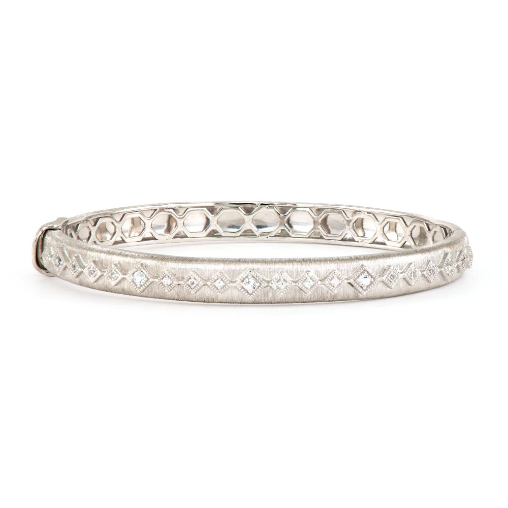 From the Sterling Silver Collection, the Sterling Silver Continuous Topaz Kite Bangle features white topaz kites along a sterling silver band set in the signature brushed JFJ finish.